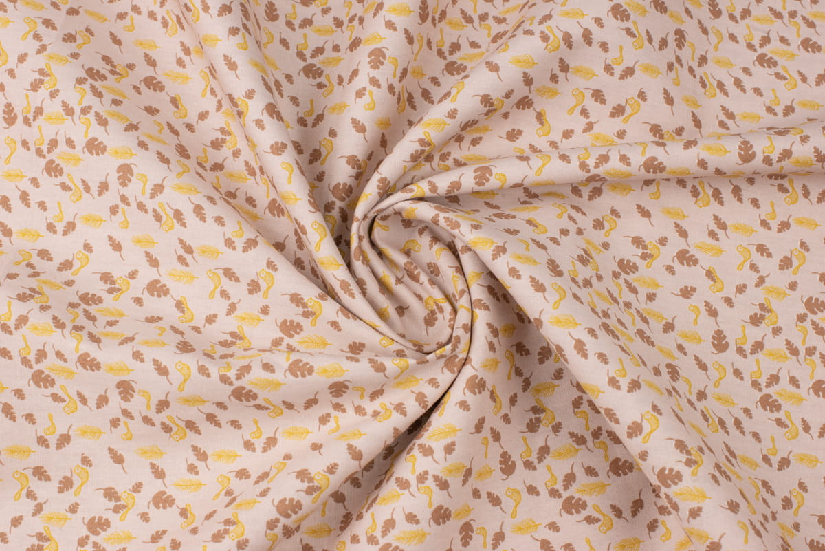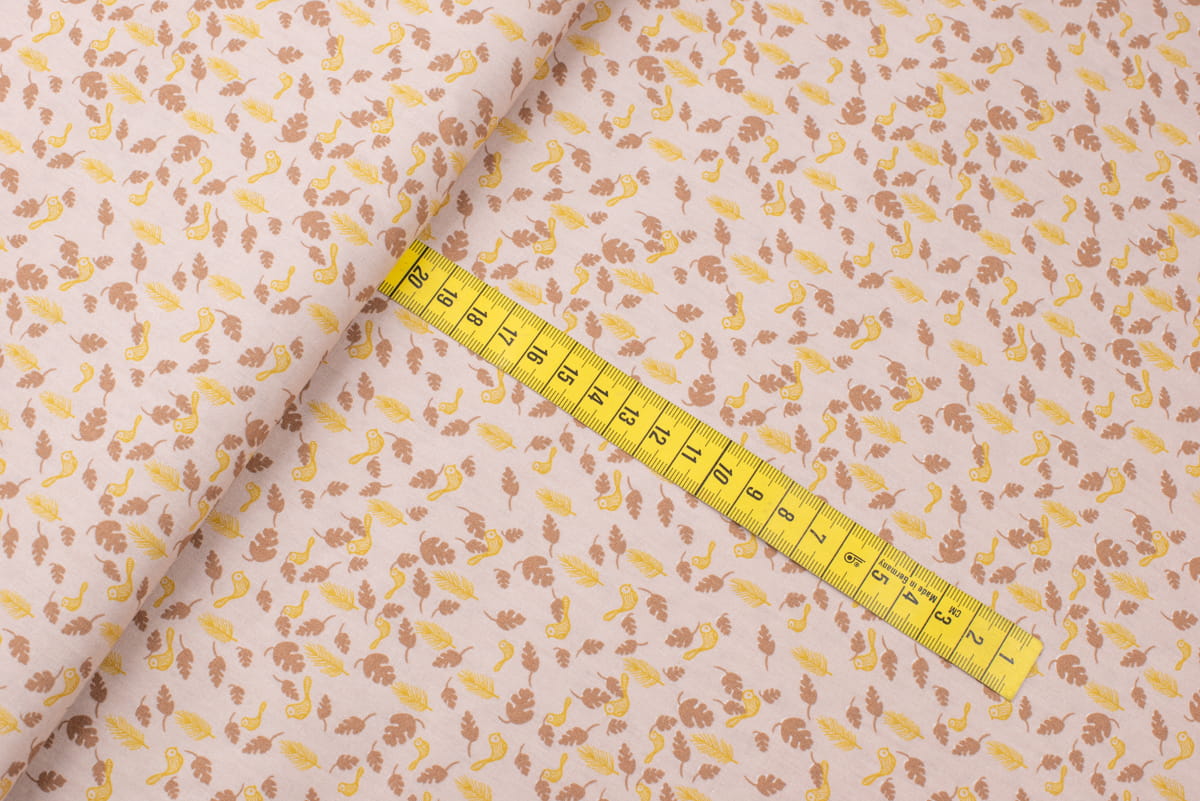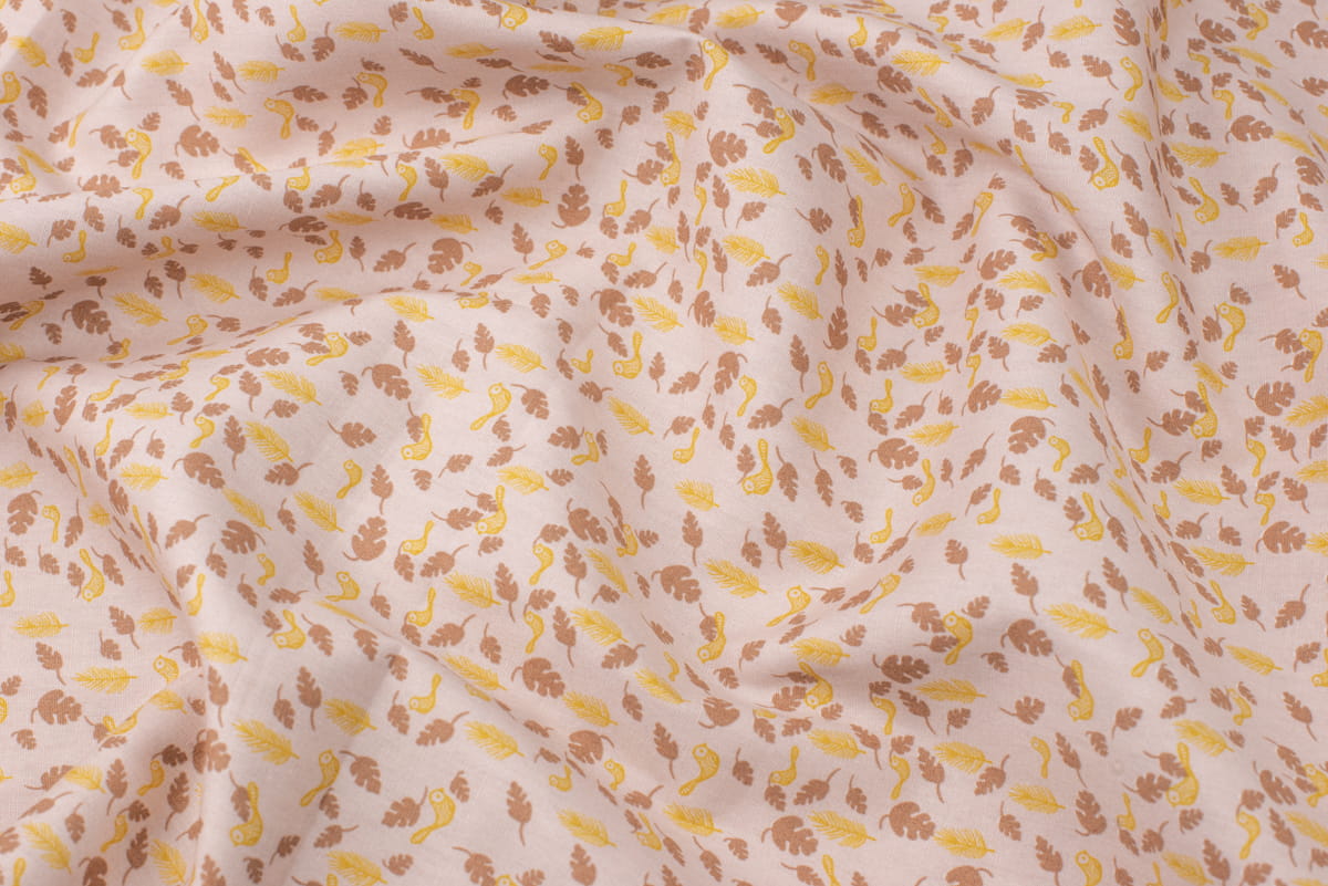Bawełna popelina organiczna wzór liście ptaki kolor beżowy