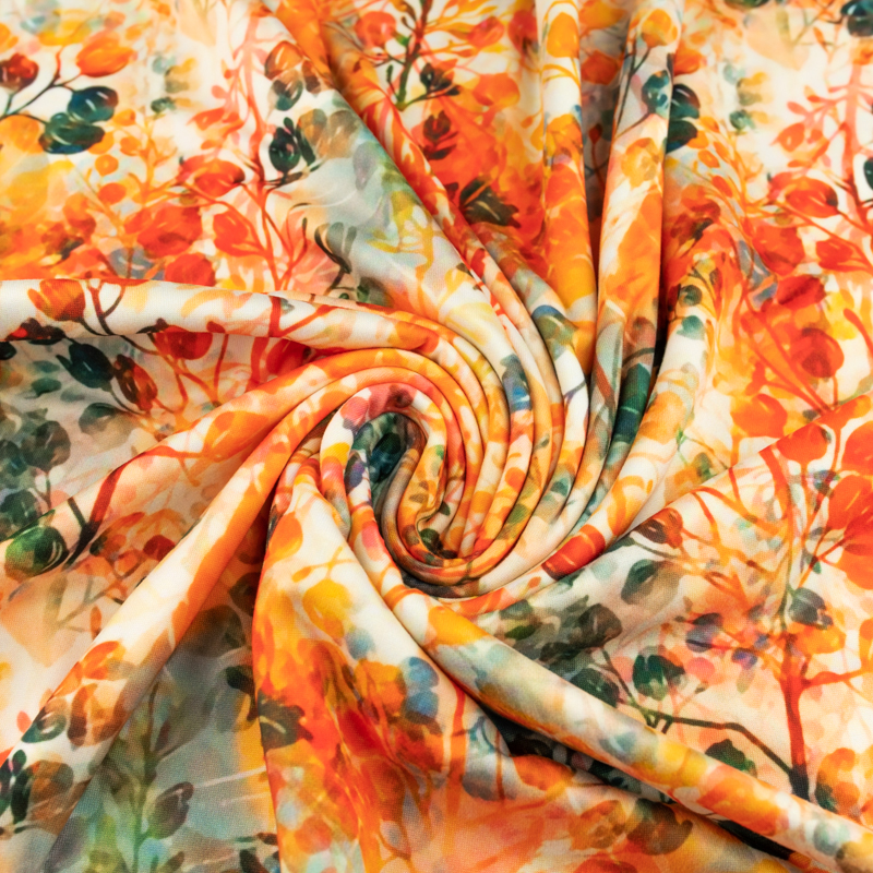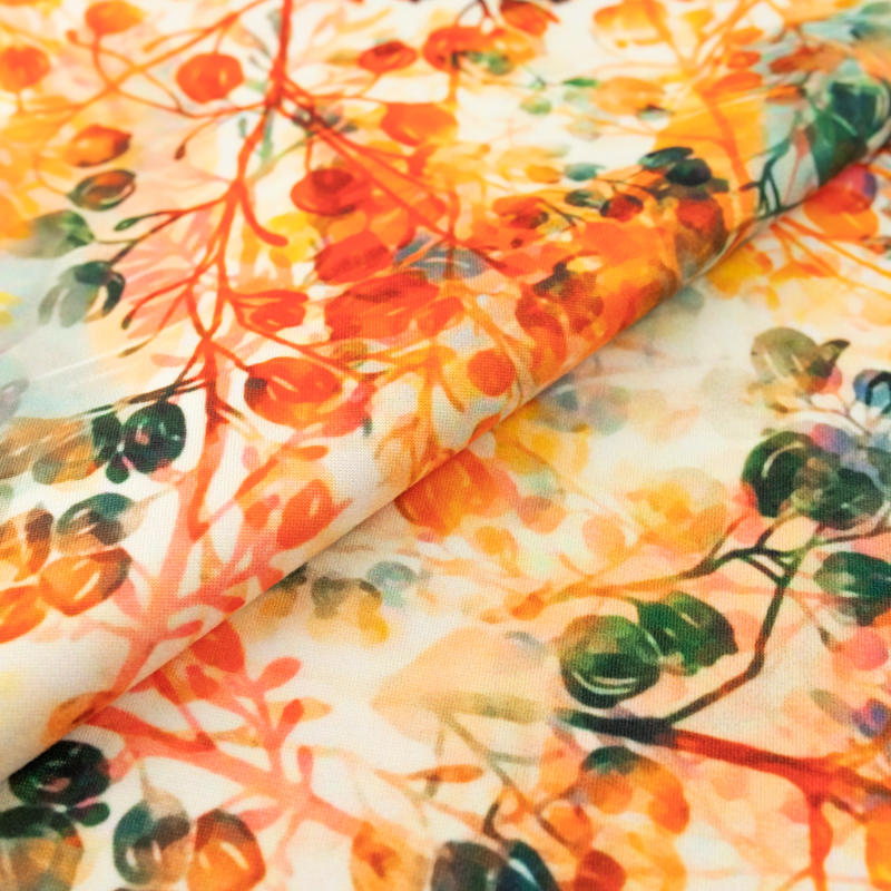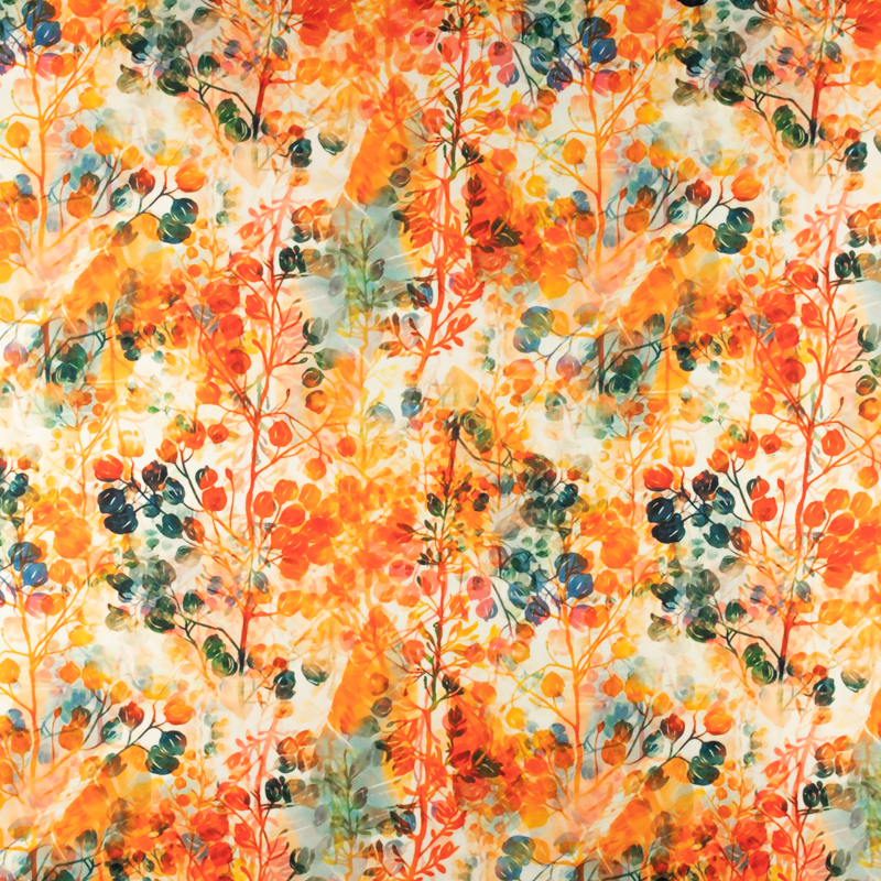 Dzianina jersey ITY Kimo w kwiaty odcienie pomarańczowego