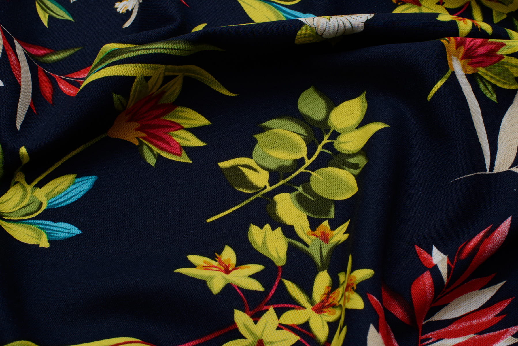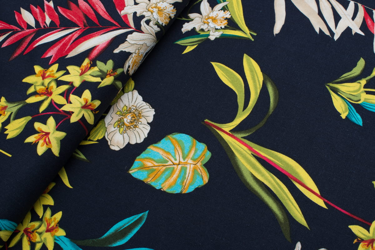 Len z wiskozą kwiatowy print / wielokolorowy na granatowym tle