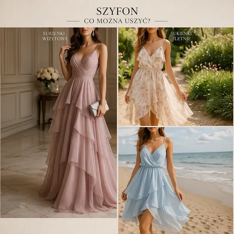Szyfon to tkanina bardzo chętnie wybierana do szycia odzieży damskiej oraz dodatków. Sprawdza się wszędzie tam, gdzie liczy się lekkość i subtelny efekt wizualny. Można wykorzystać go między innymi do: