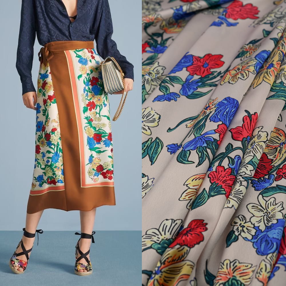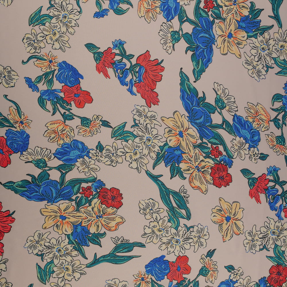 Jasny beż w połączeniu z delikatnymi kwiatami nadaje materiałowi elegancki, kobiecy wygląd. Satynowa struktura dodaje tkaninie luksusowego blasku.