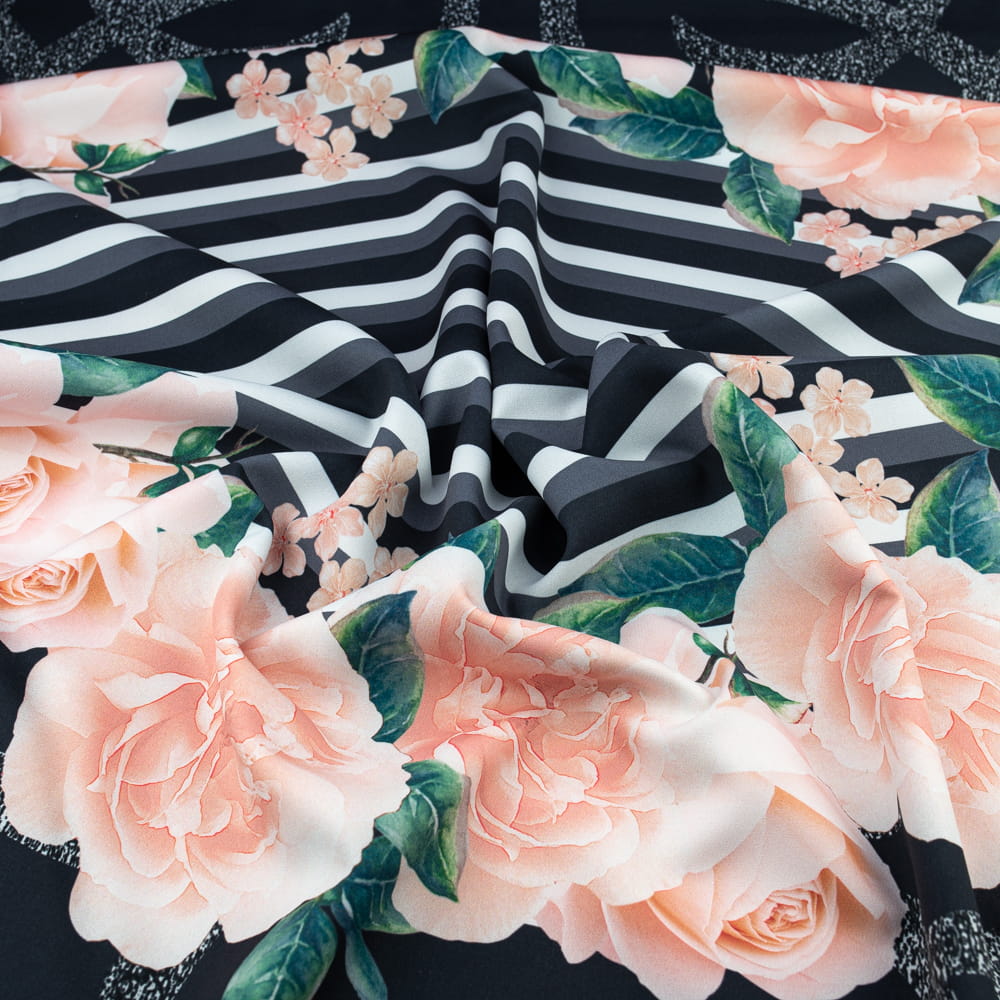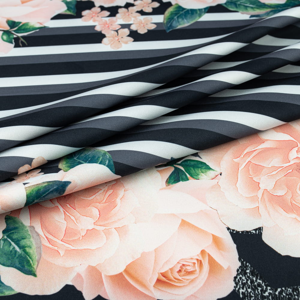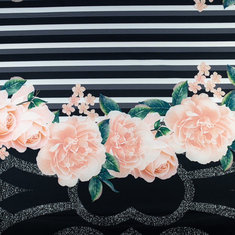 Tkanina Barbie wzór kwiaty i pasy KUPON 150 cm