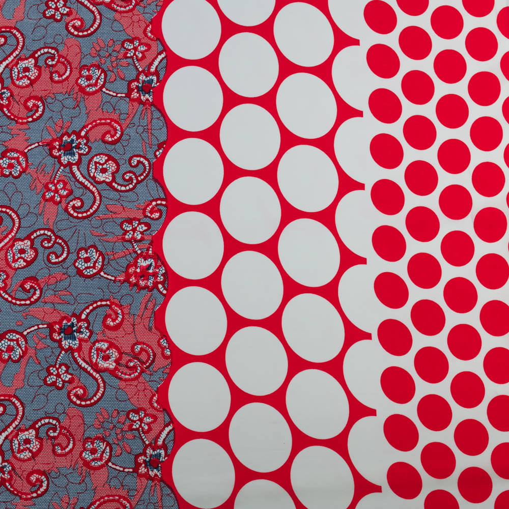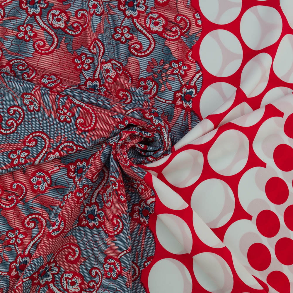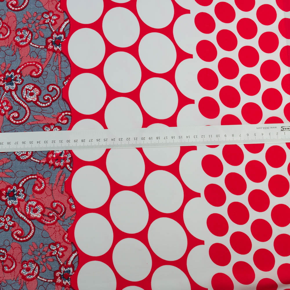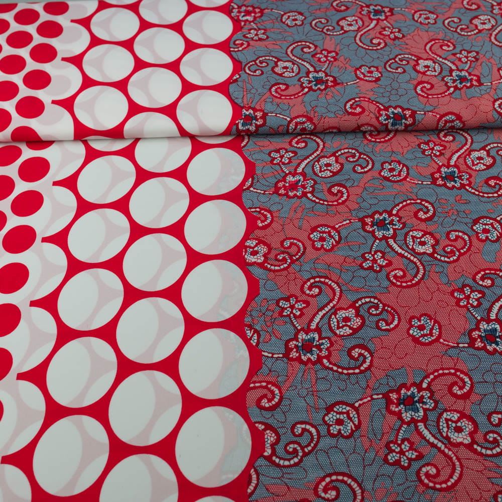 Tkanina Krepa grochy i kwiaty border dwustronny czerwony