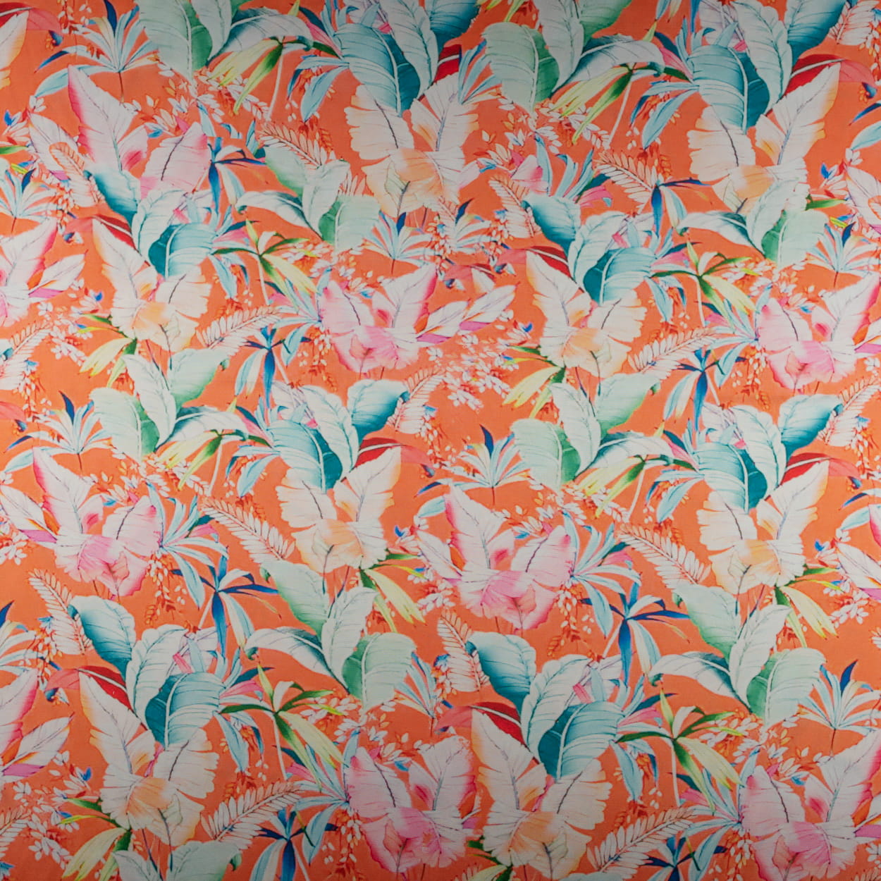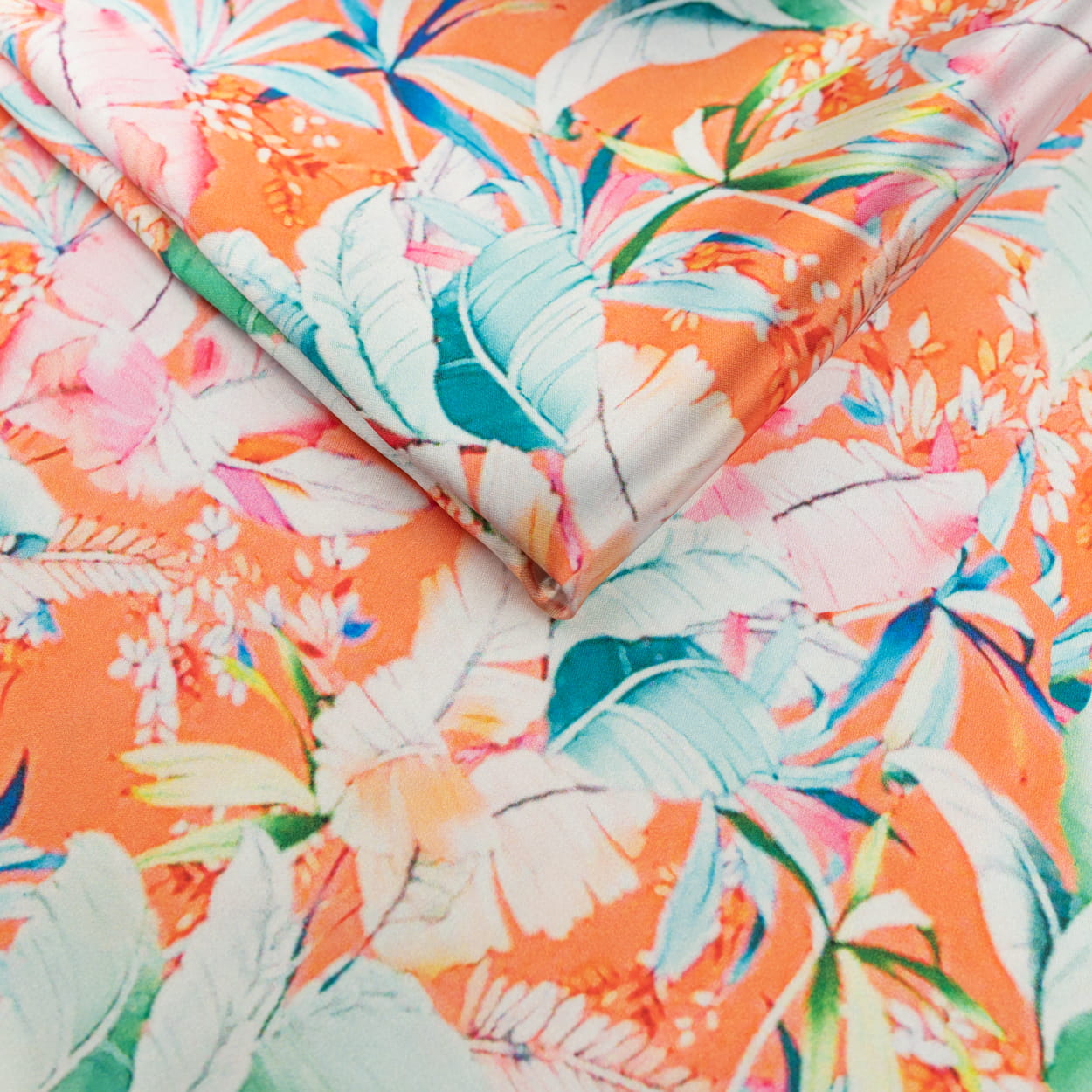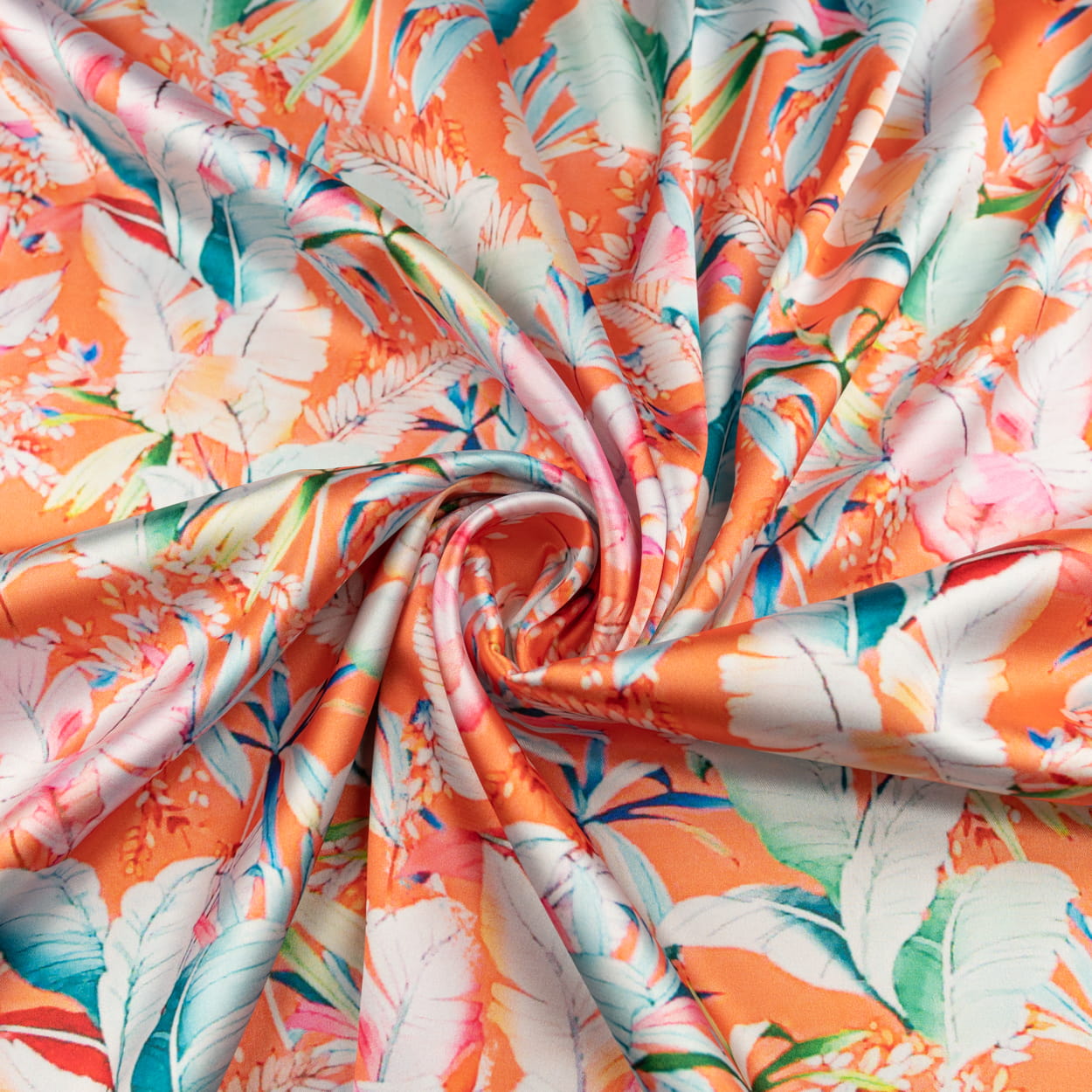 Tkanina Satyna lycra liście tropikalne tło pomarańczowe