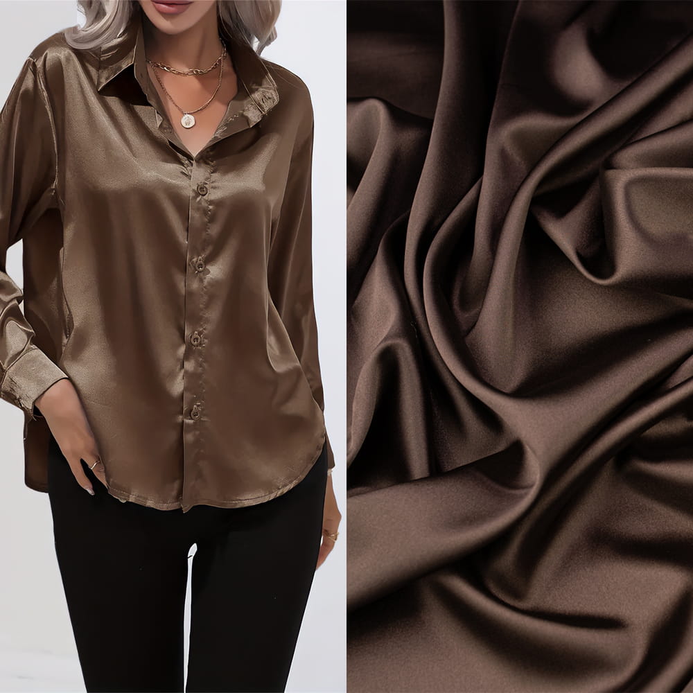 Satyna z lycrą w kolorze czekoladowego brązu to tkanina, która łączy w sobie intensywny, ciepły odcień brązu z delikatnym połyskiem i wyjątkową miękkością. Gładka powierzchnia i elastyczność sprawiają, że materiał pięknie układa się na sylwetce, a jego kolor przywodzi na myśl klasyczną czekoladę. To idealna propozycja na sukienki, spódnice, eleganckie komplety oraz stylowe dekoracje.