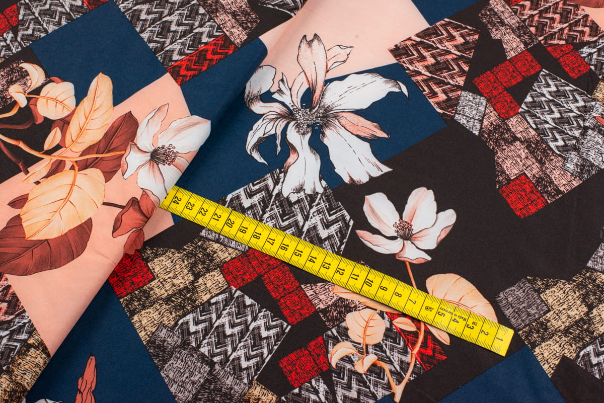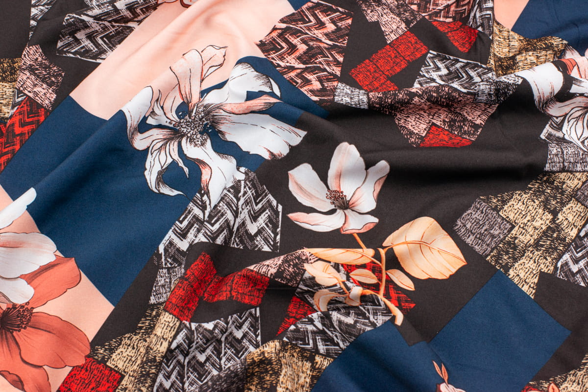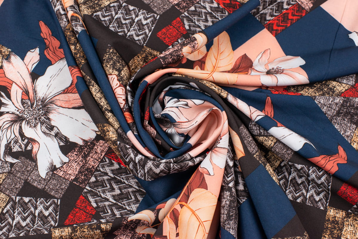 Tkanina Silki Wzór kwadraty i kwiaty kolor granatowy /czary
