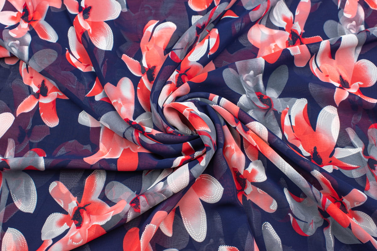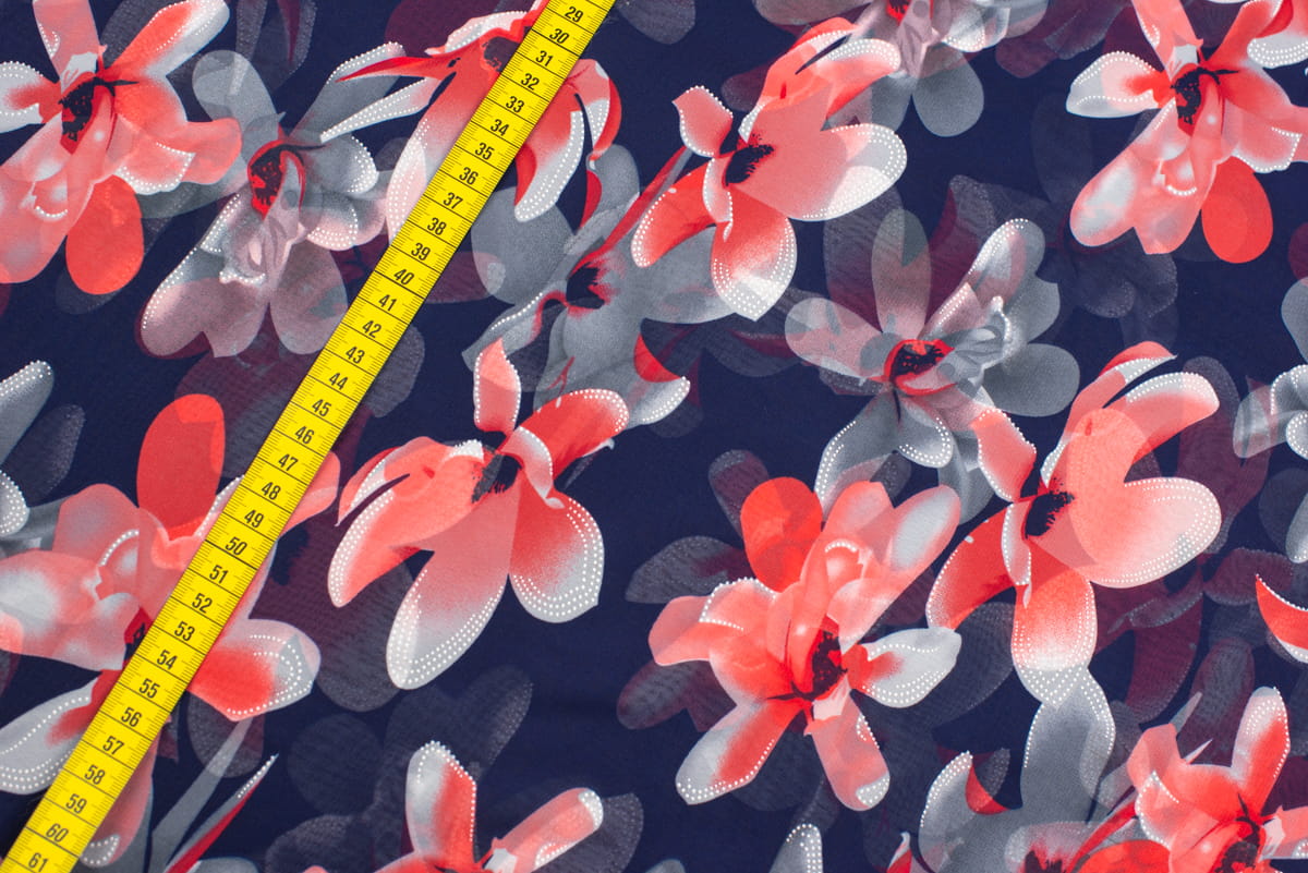 Tkanina Szyfon wzór Czerwone Kwiaty Kolor Granatowy