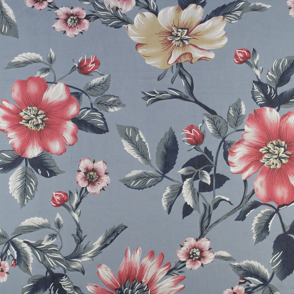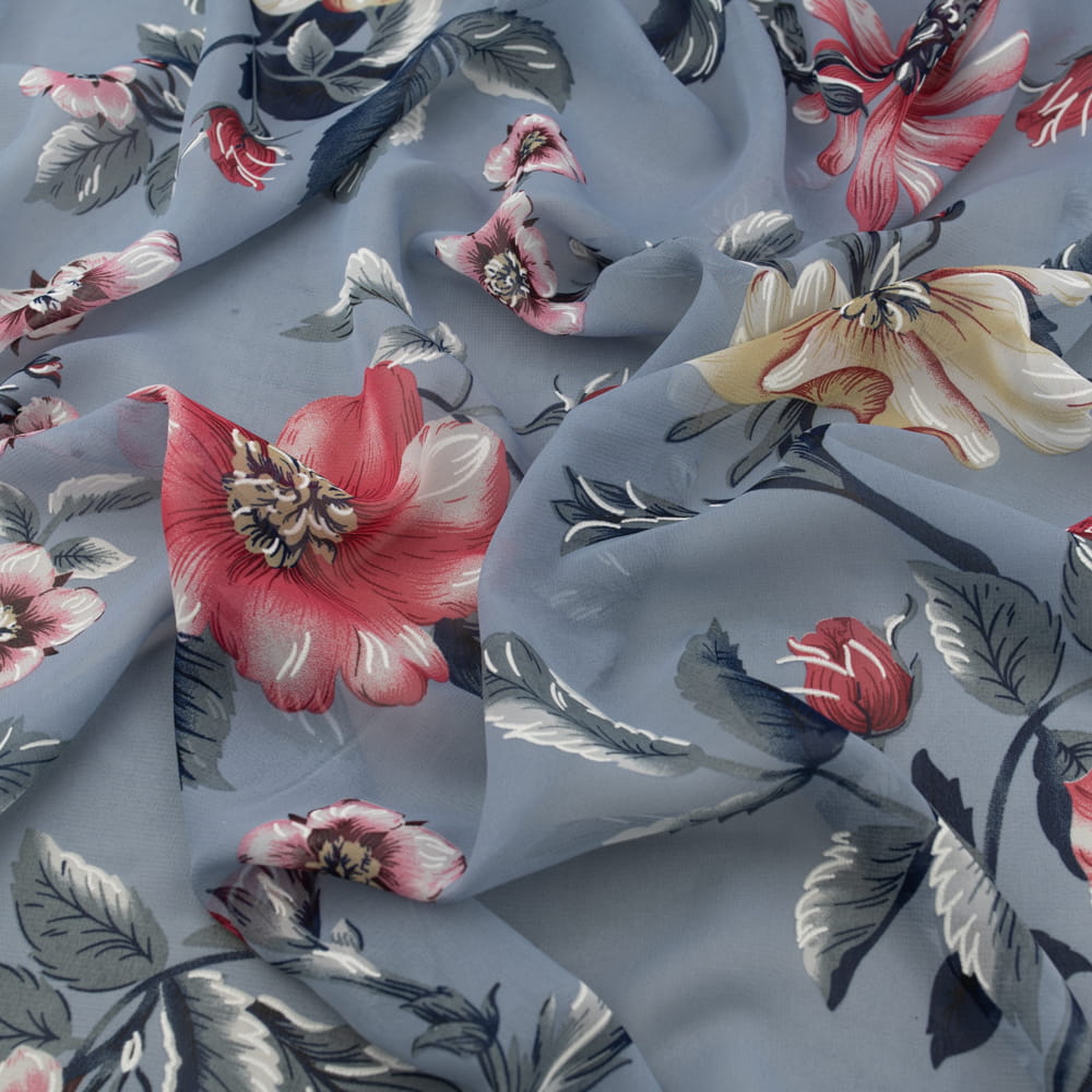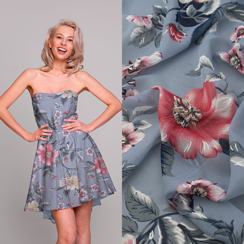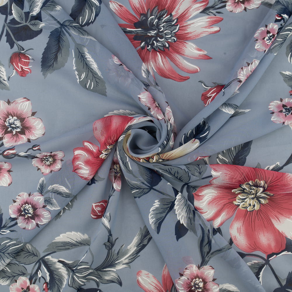 Tkanina Szyfon wzór kwiaty kolor błękitno szary