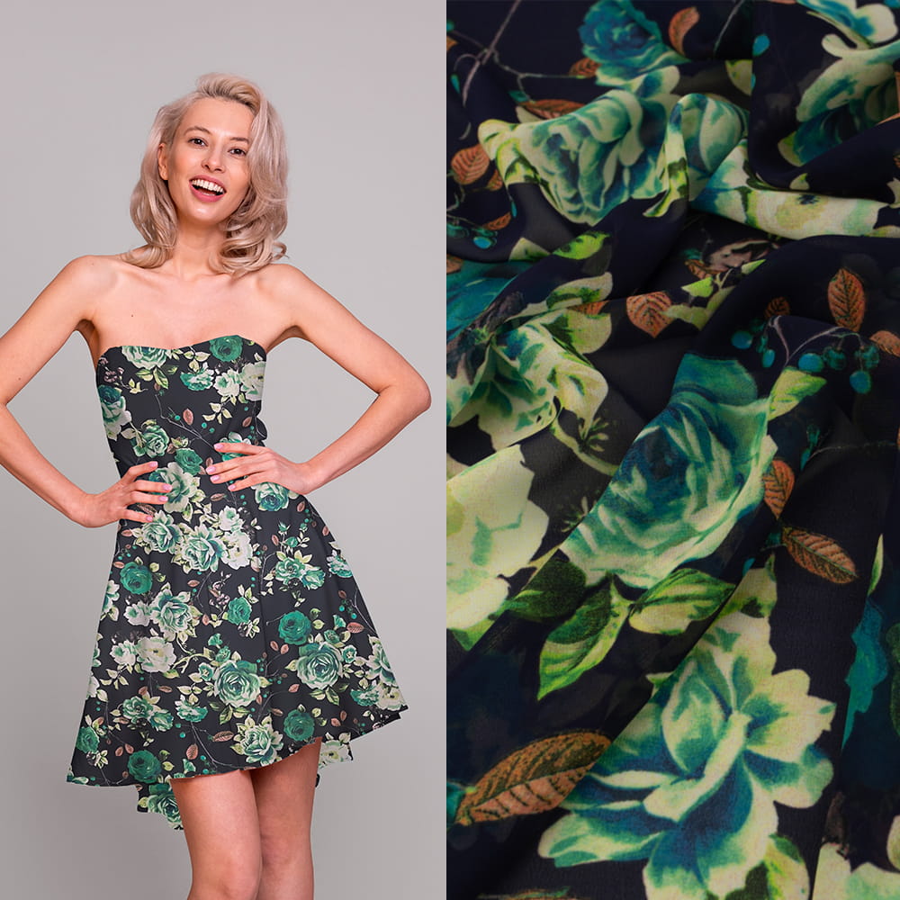 Szyfon z wzorem kwiatowym w kolorze granatowym to lekka, zwiewna tkanina, która łączy elegancję z subtelnym wzornictwem. Doskonały wybór na modne, kobiece kreacje oraz efektowne dekoracje.