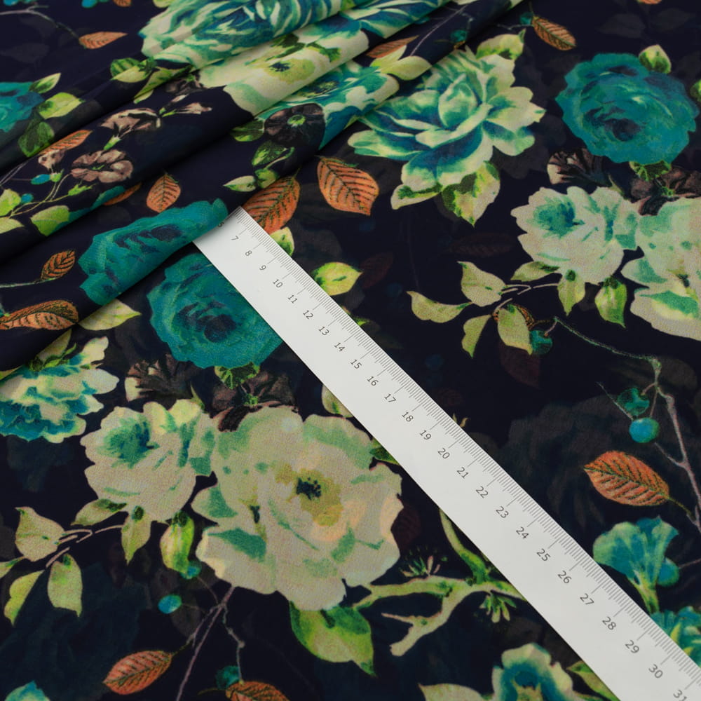 Granatowy odcień z motywem kwiatowym nadaje tkaninie klasy i wyrafinowania, idealnie wpisując się w wieczorowe i codzienne stylizacje.