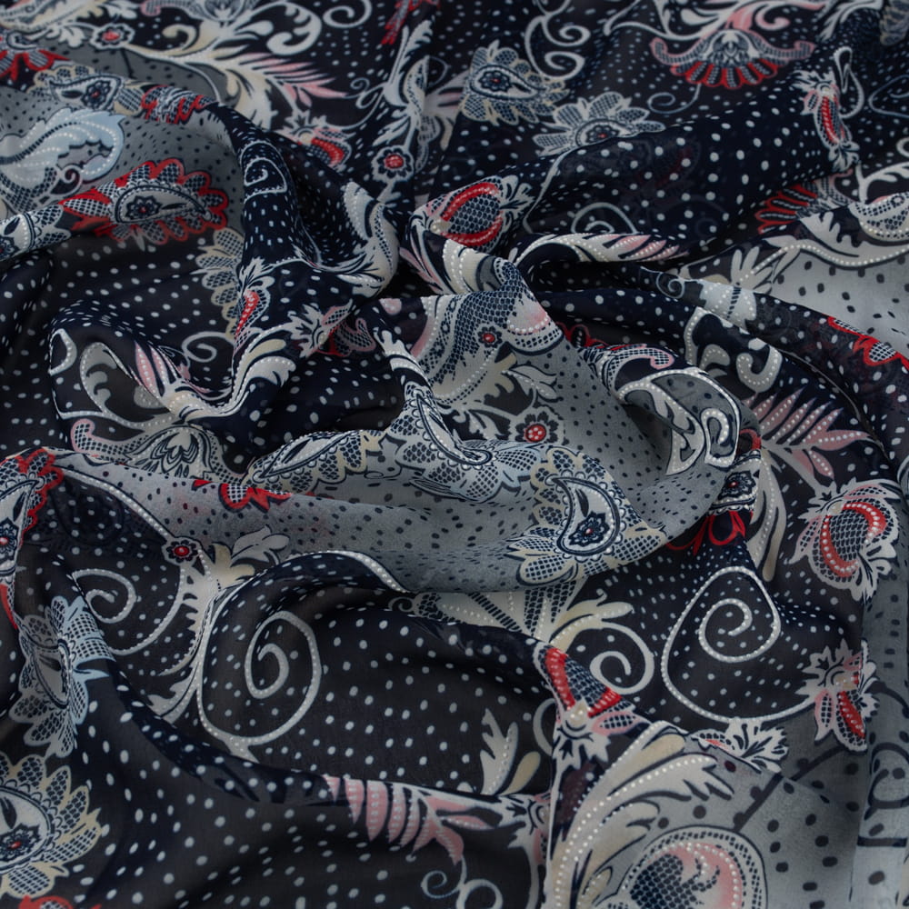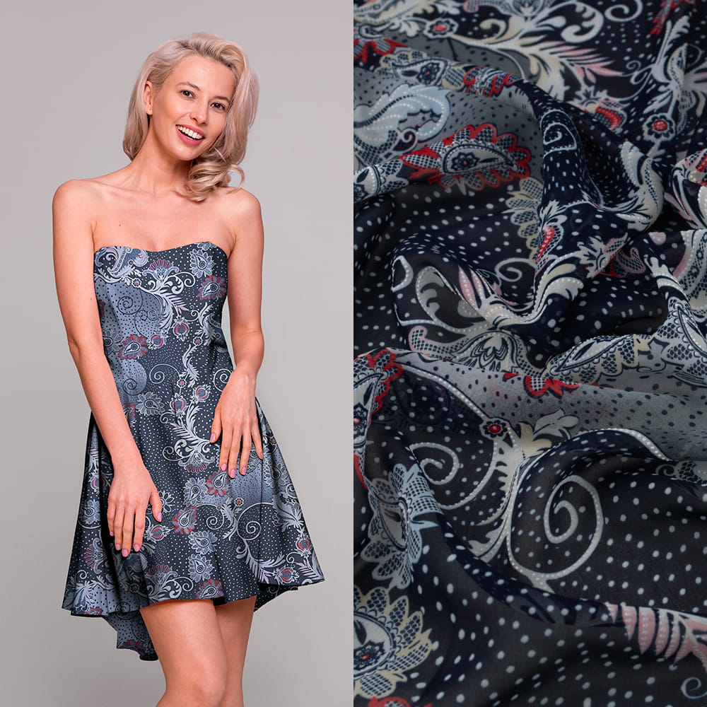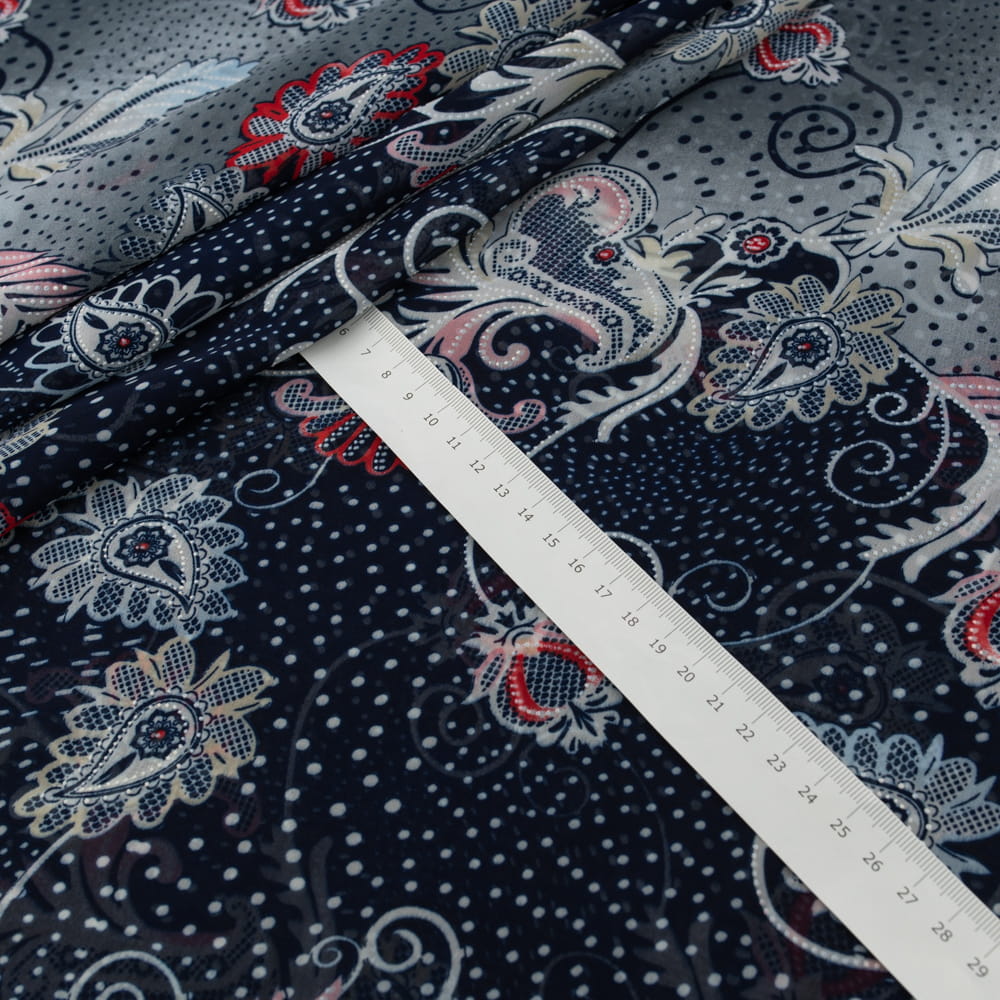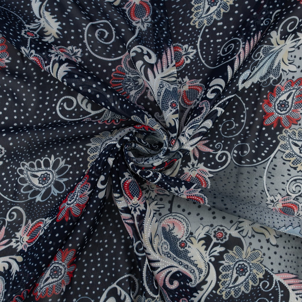 Szyfon z wzorem kwiatowym w kolorze granatowym to wyjątkowo lekki i zwiewny materiał, który łączy elegancję z subtelnym wzornictwem. Doskonały wybór na modne, kobiece kreacje oraz oryginalne dekoracje.