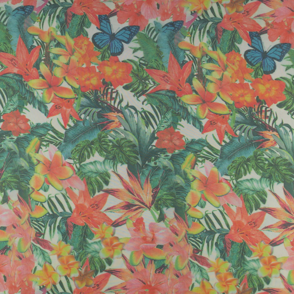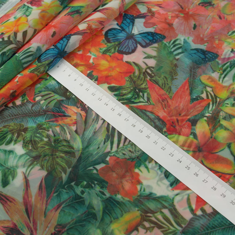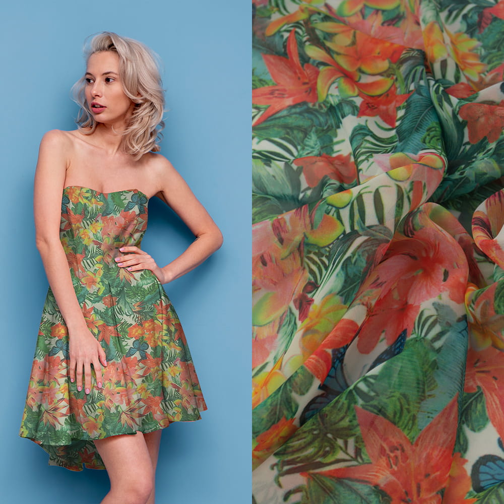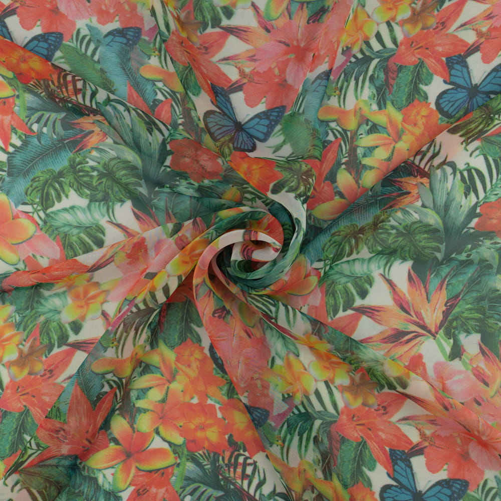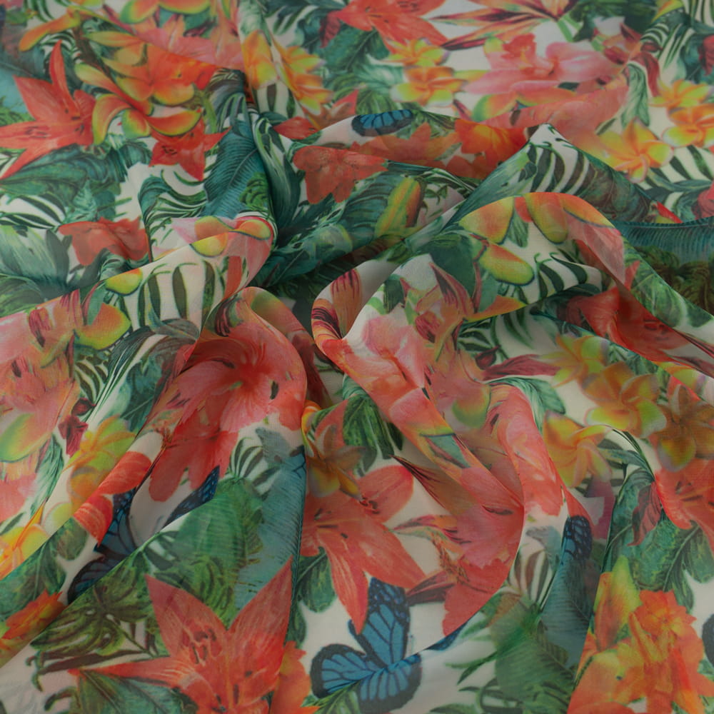 Tkanina Szyfon wzór kwiaty kolor pomarańczowo zielony