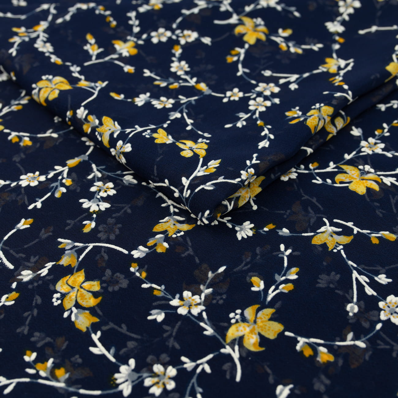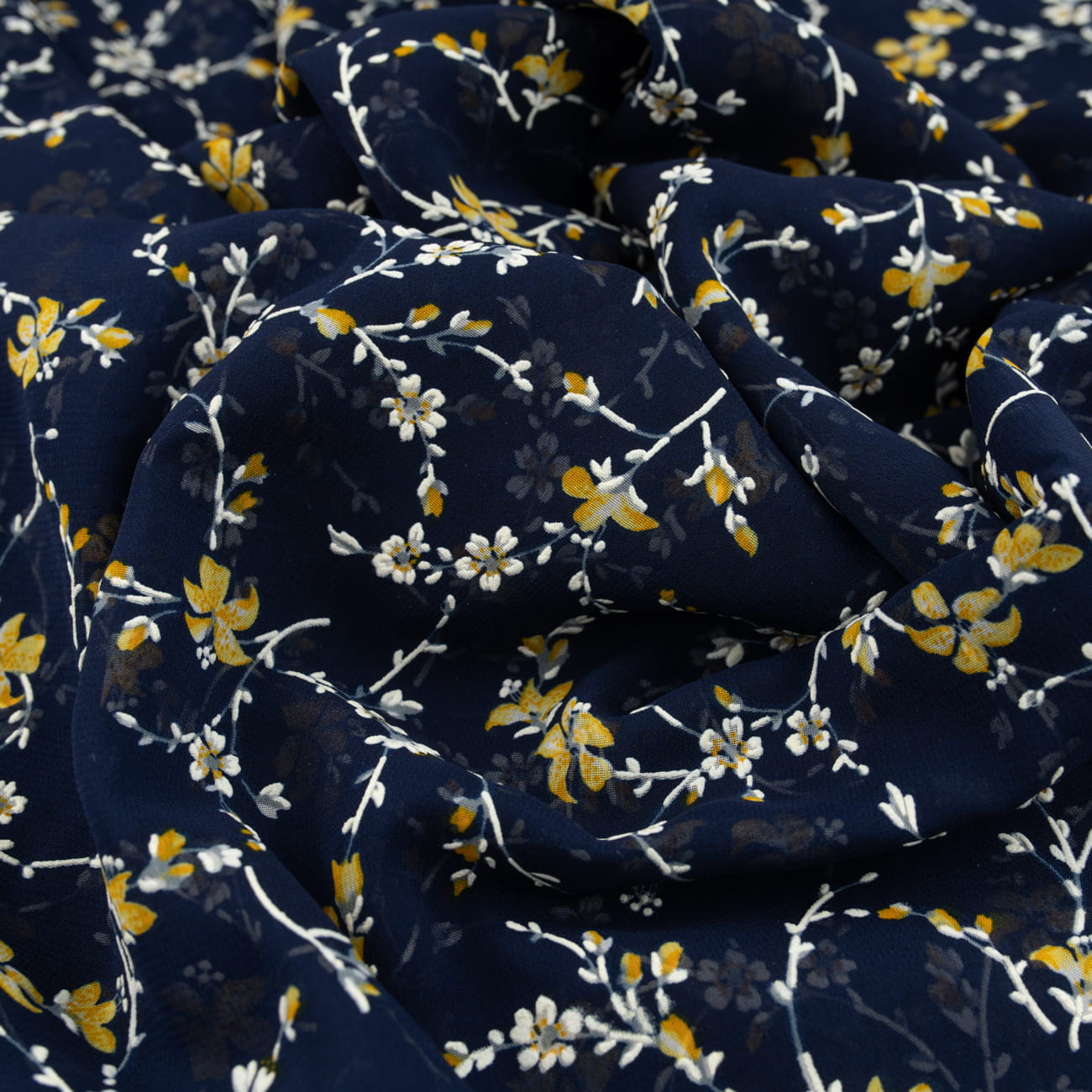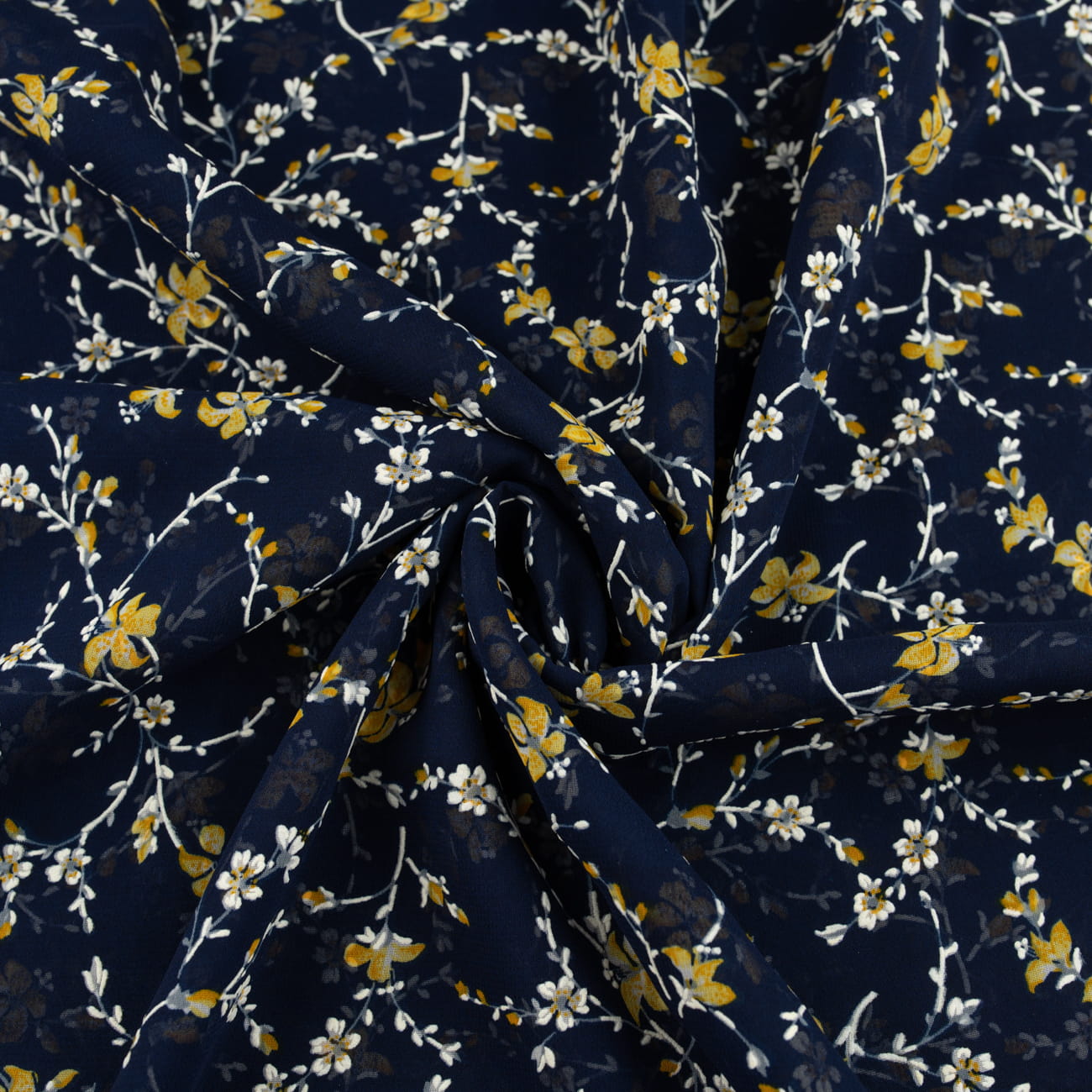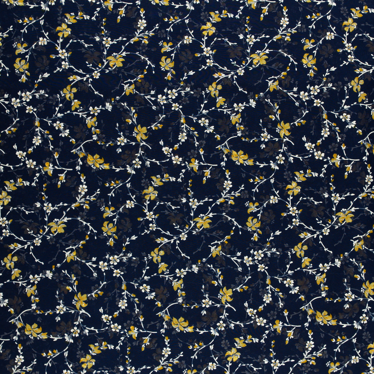 Tkanina Szyfon wzór miodowe kwiatki na granatowym tle