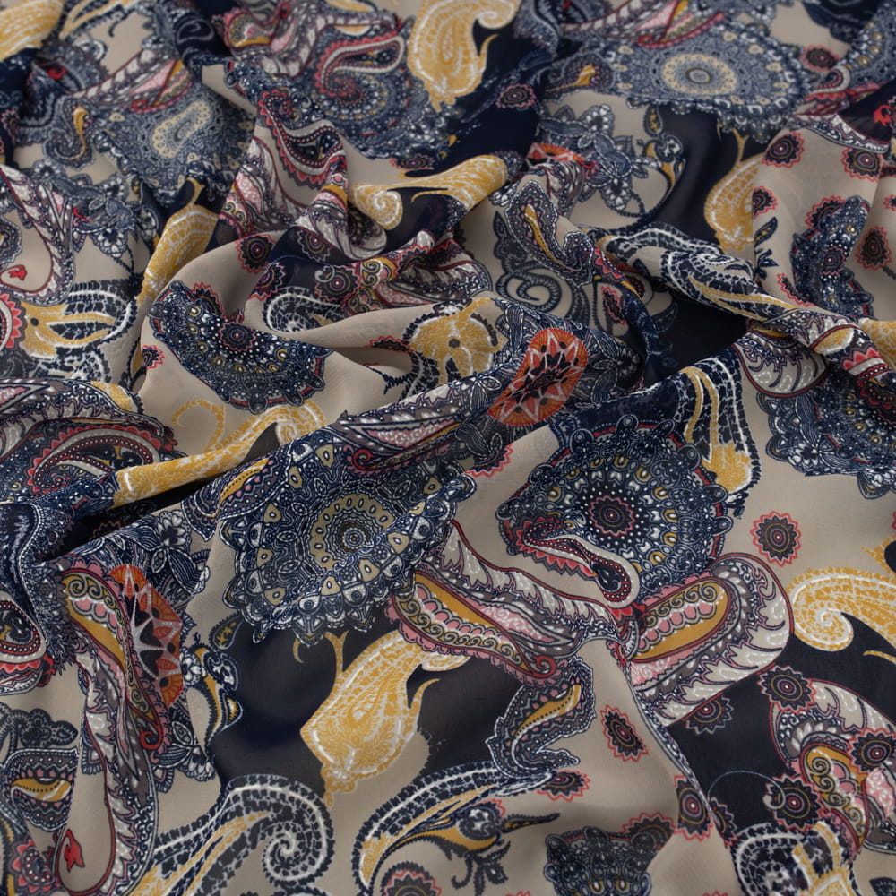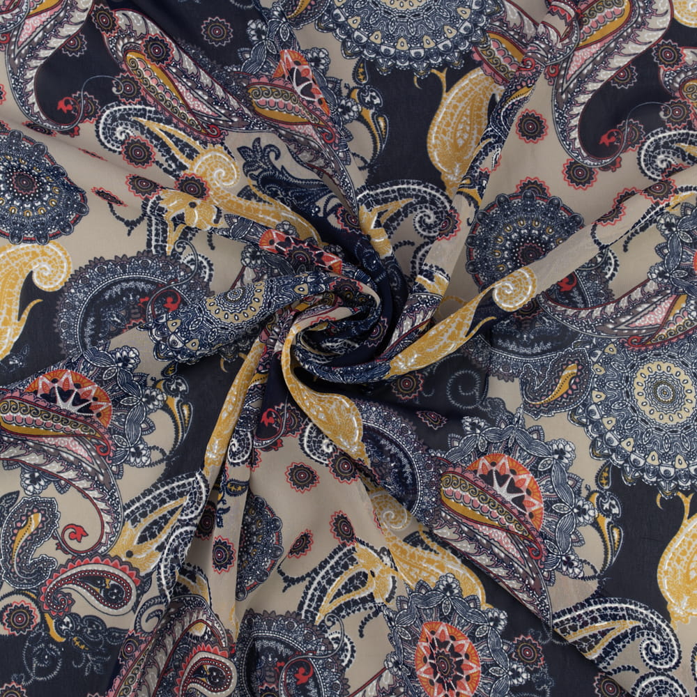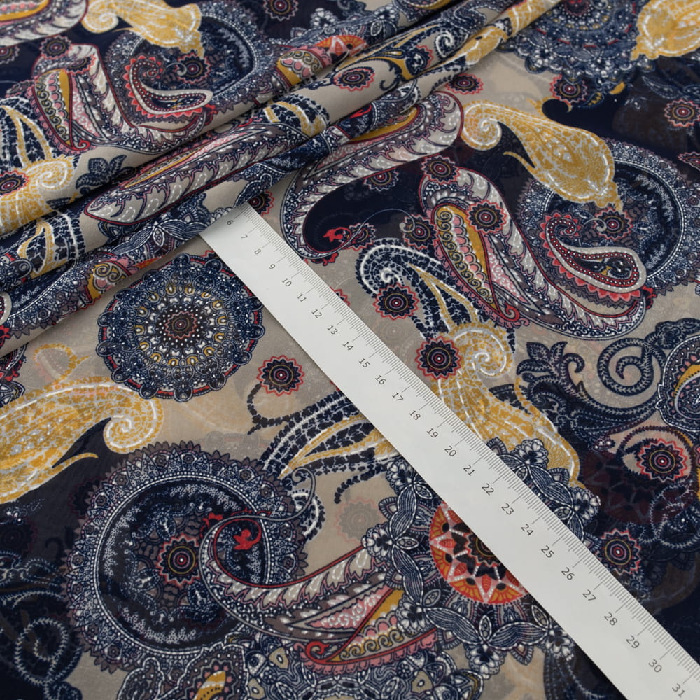 Tkanina Szyfon wzór paisley kolor granatowo beżowy