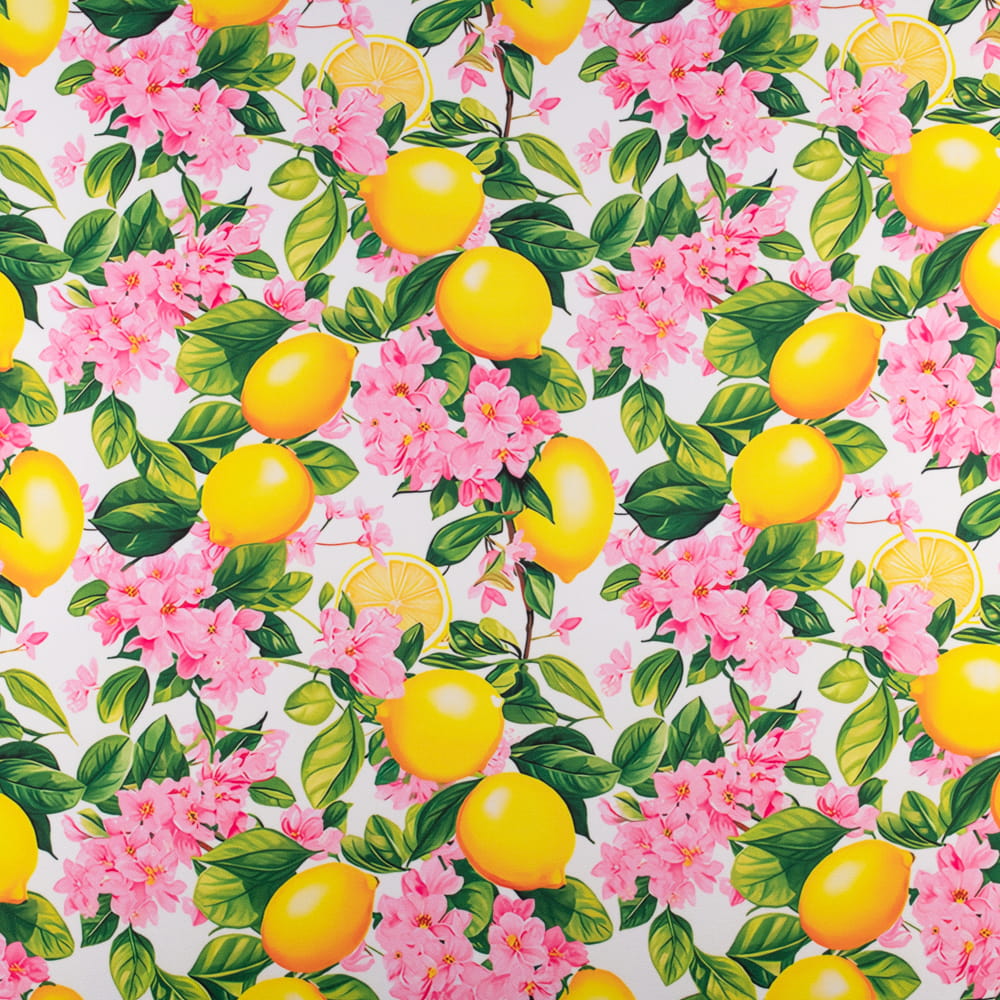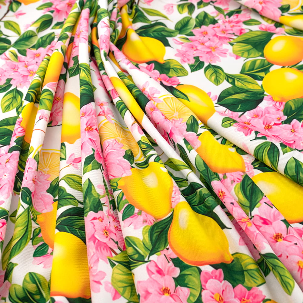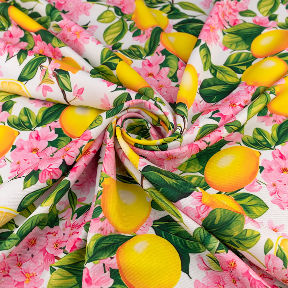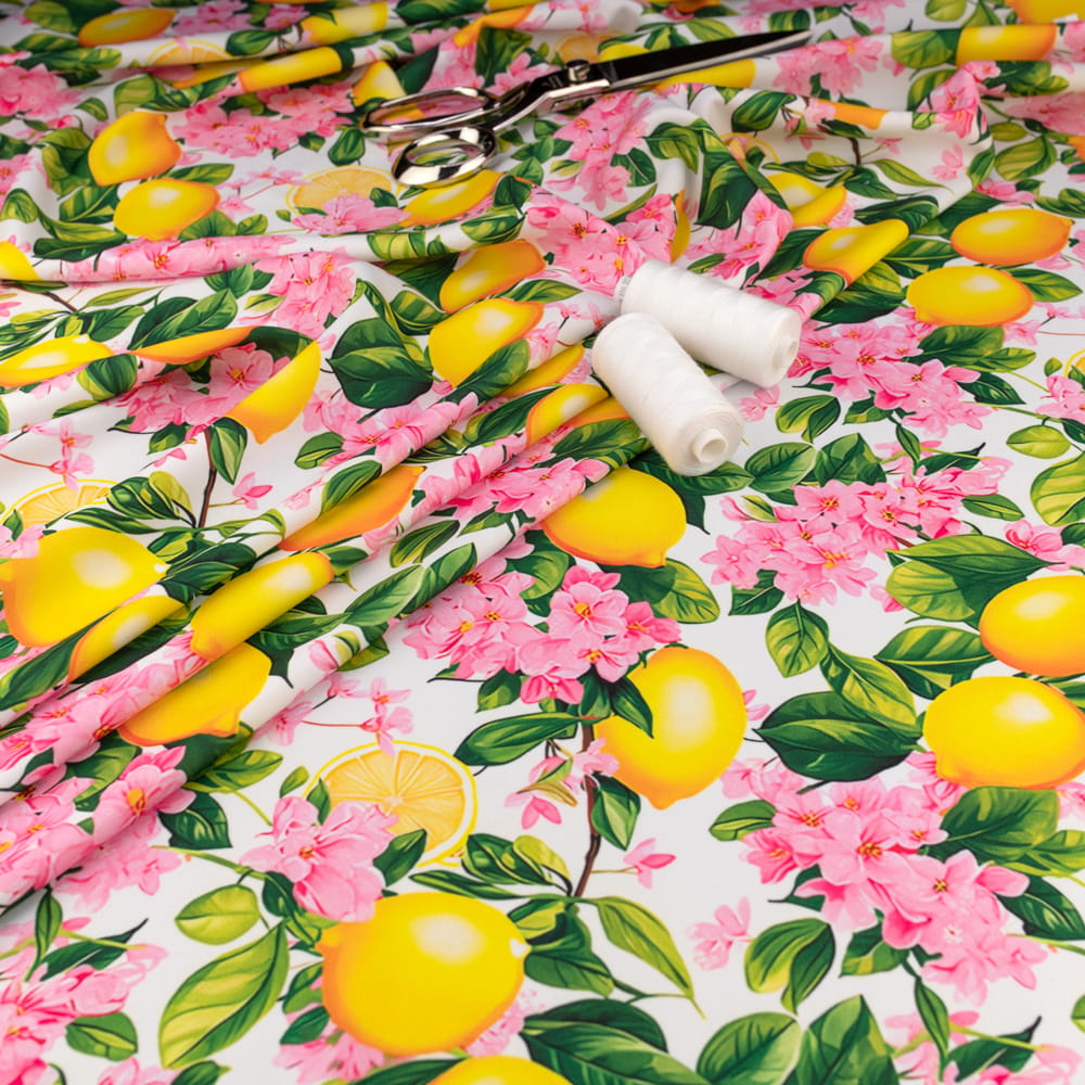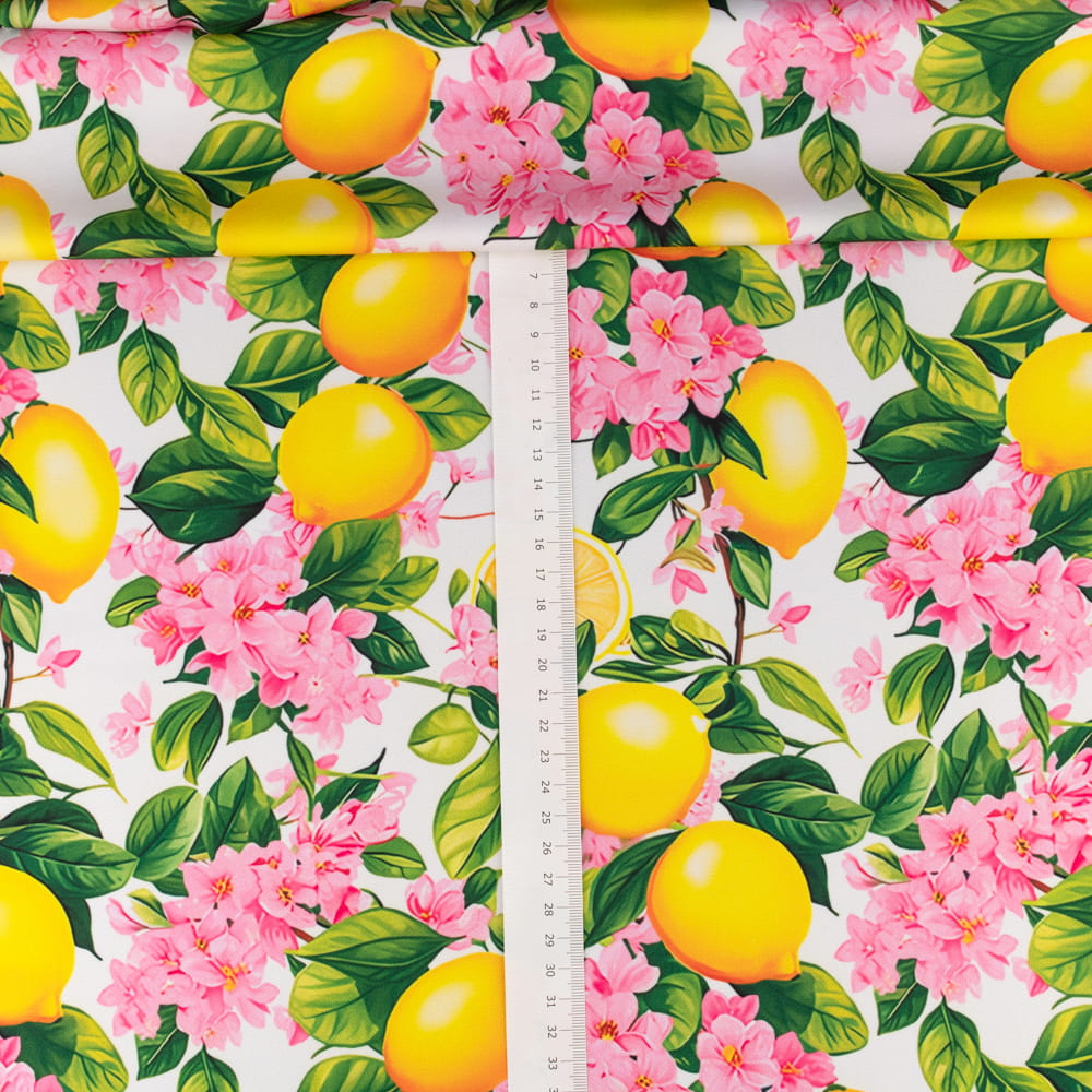 Tkanina Wiskoza Twill – wzór cytryny, kolor biały