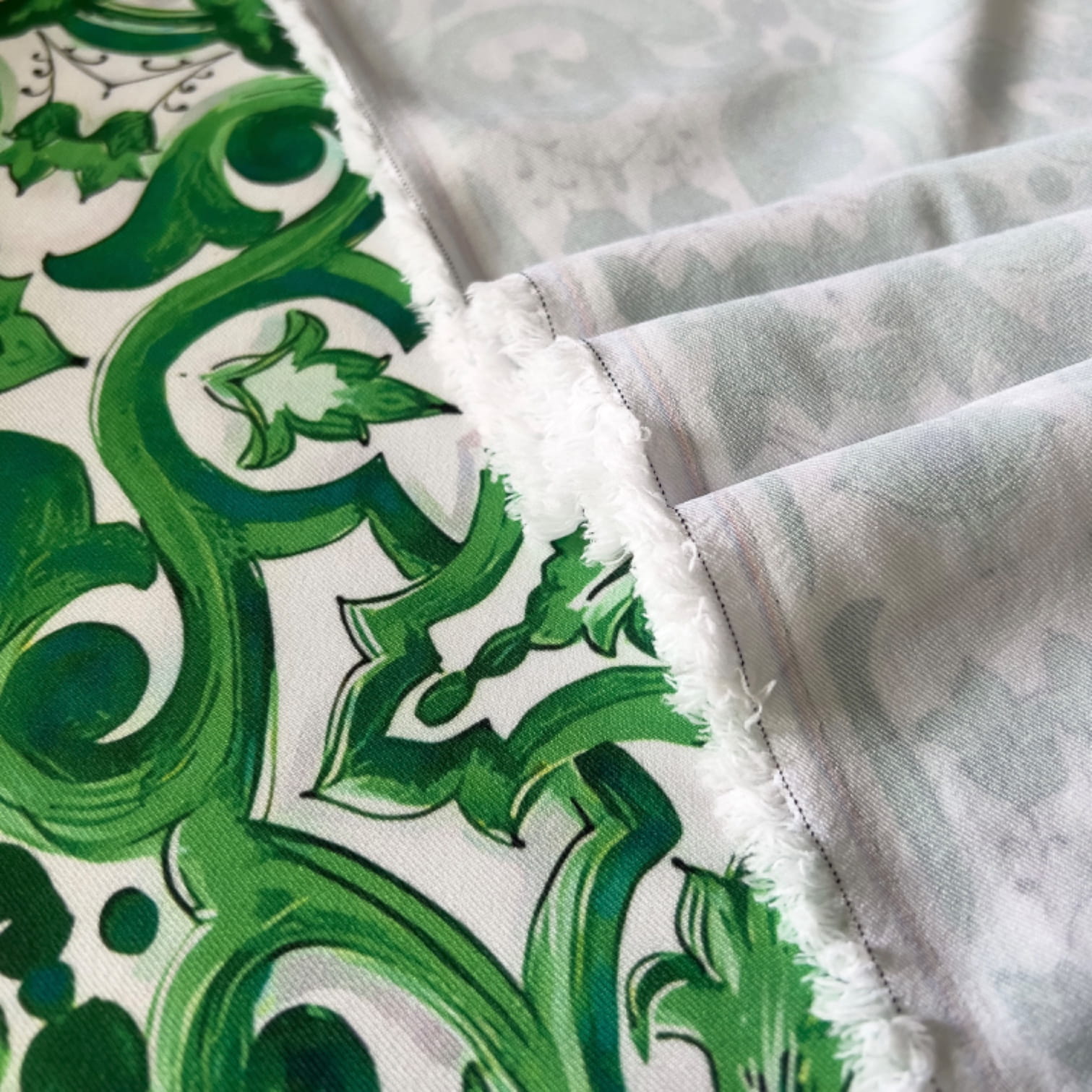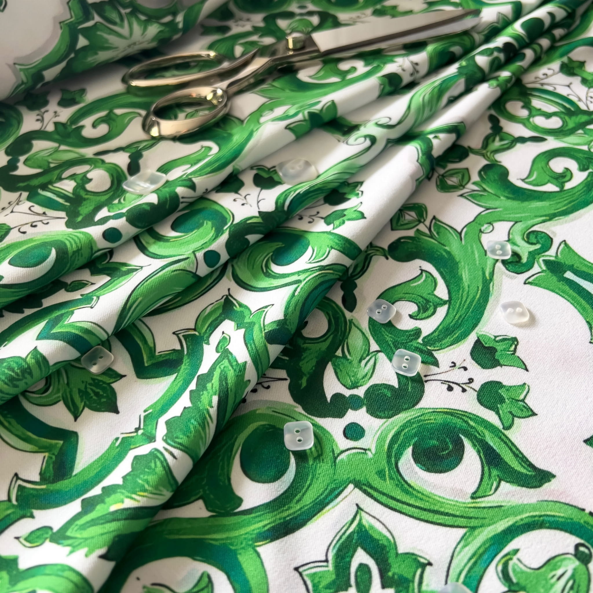 Tkanina wiskozowa typu twill ozdobiona klasycznym wzorem inspirowanym włoską majoliką w odcieniach zieleni. Jej miękka, lekko elastyczna struktura doskonale układa się na sylwetce, zapewniając wygodę noszenia oraz unikalny, artystyczny wygląd. To doskonały wybór dla osób ceniących elegancję i śródziemnomorskie motywy w nowoczesnym wydaniu.