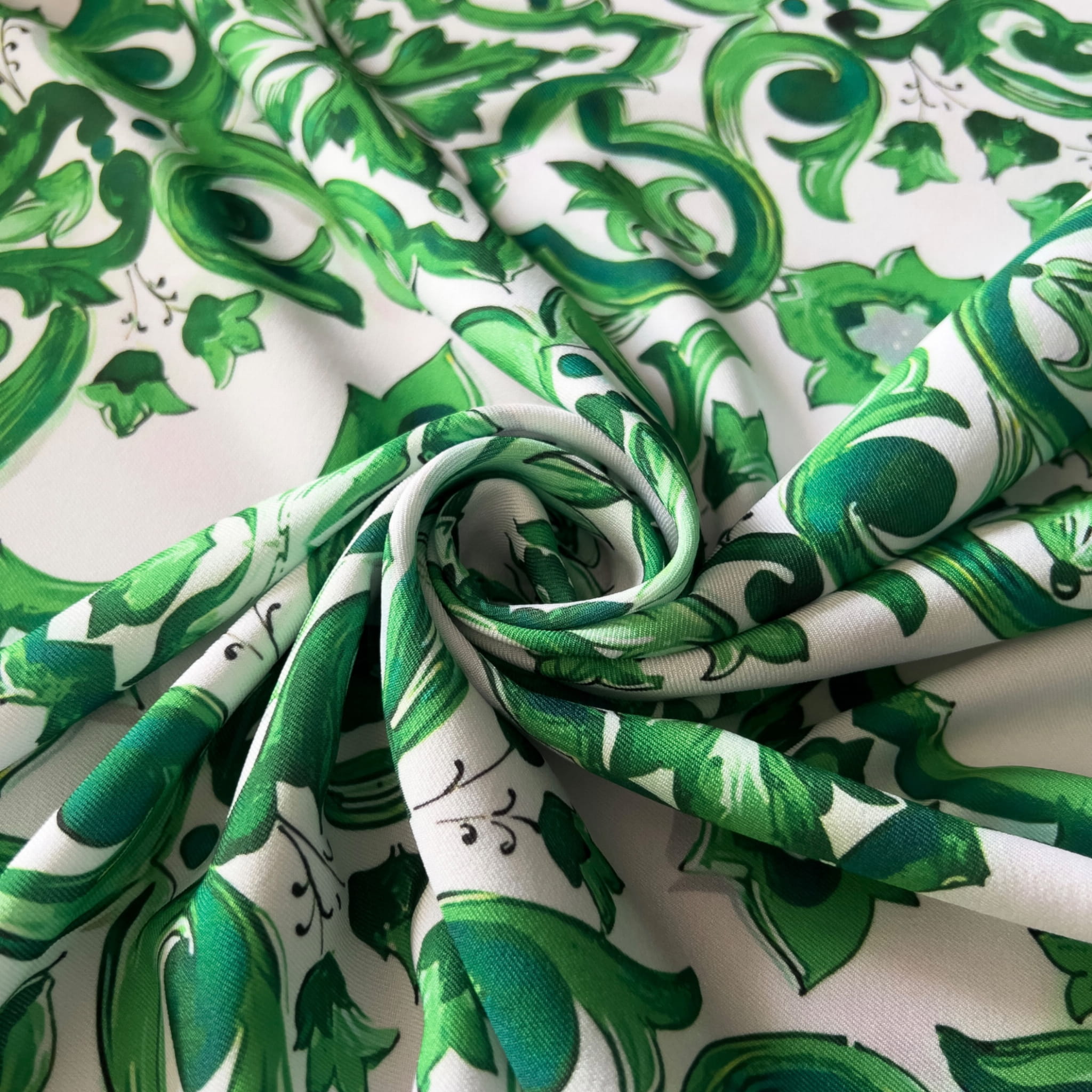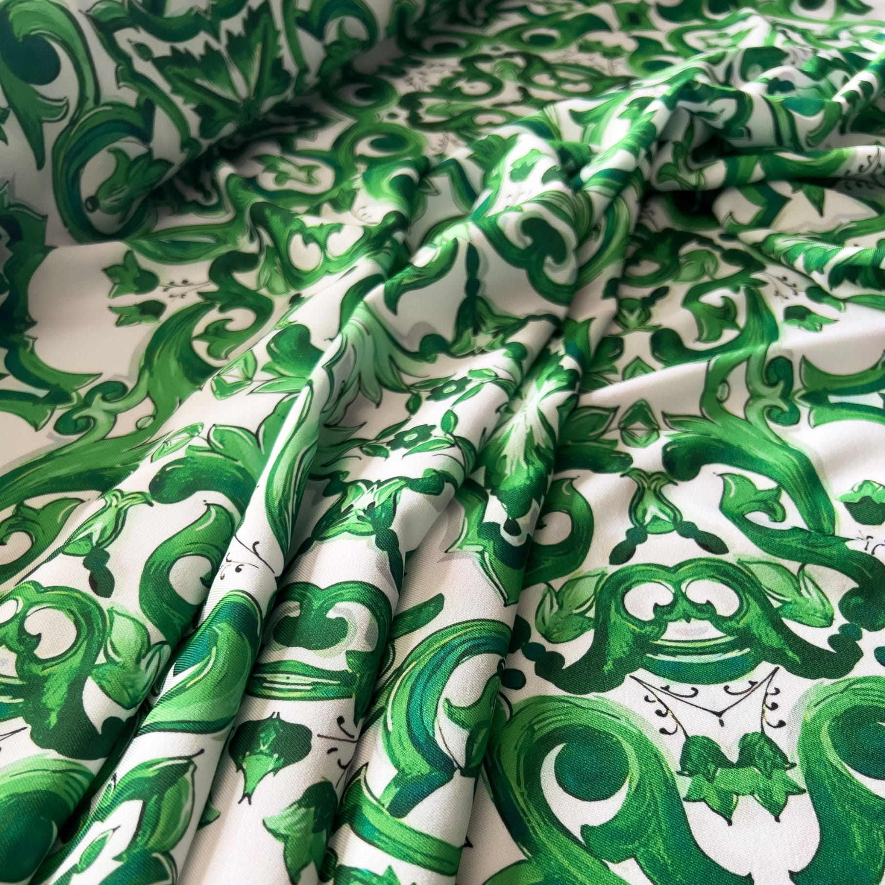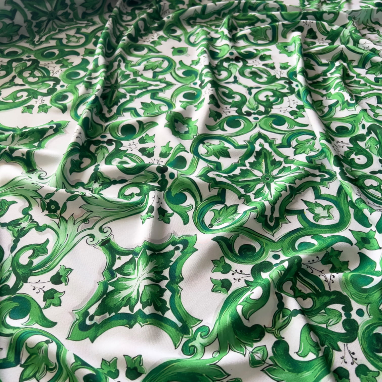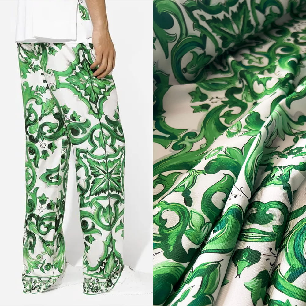 Tkanina wiskozowa twill z wzorem majoliki w odcieniach zieleni to doskonały wybór dla osób ceniących luksusowe i artystyczne wzory inspirowane włoską sztuką. Zamów już teraz i stwórz unikatowe stylizacje!