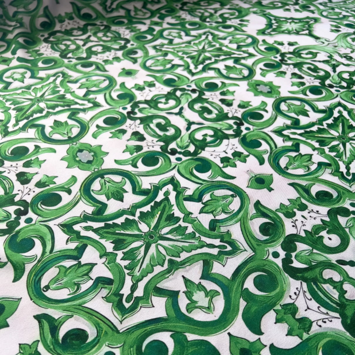 Tkanina Wiskoza Twill – wzór majolika, kolor zielony