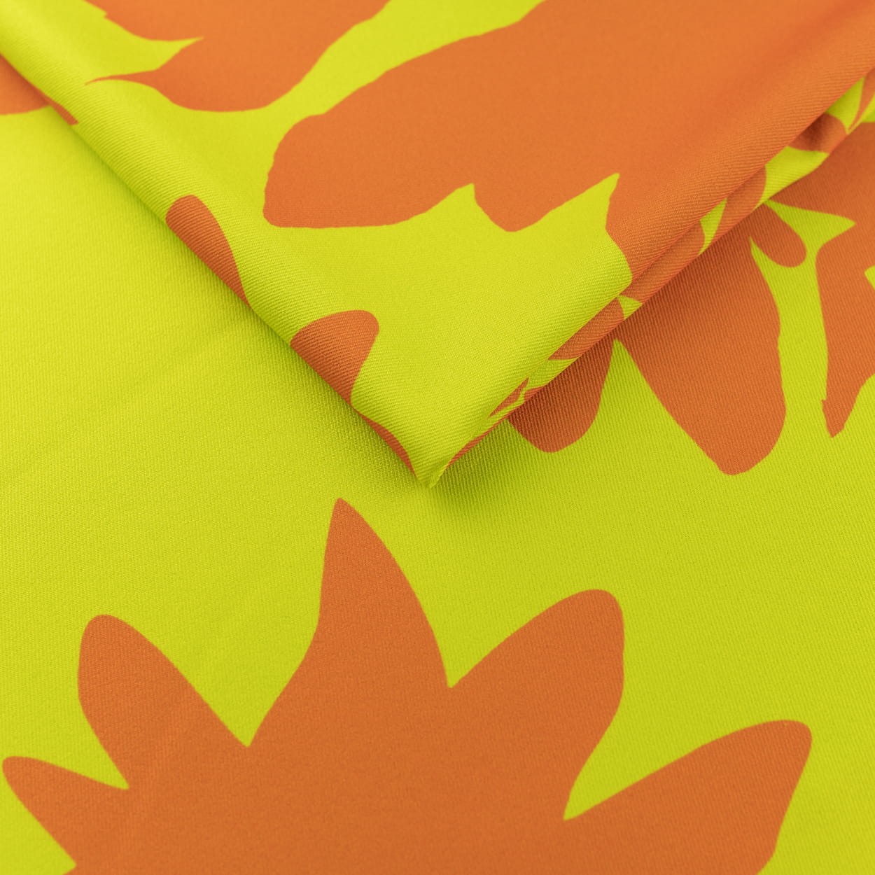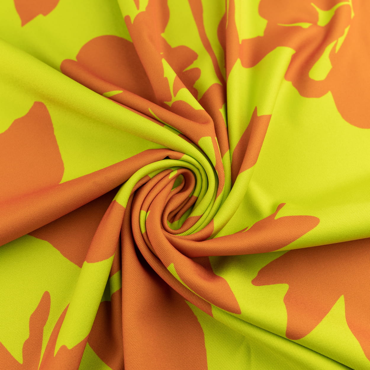 Postaw na oryginalność i stwórz unikalne projekty z tkaniny, która inspiruje. Tkanina Wiskoza Twill z zielono-pomarańczowym mazanym wzorem to materiał, który ożywi każdą garderobę.