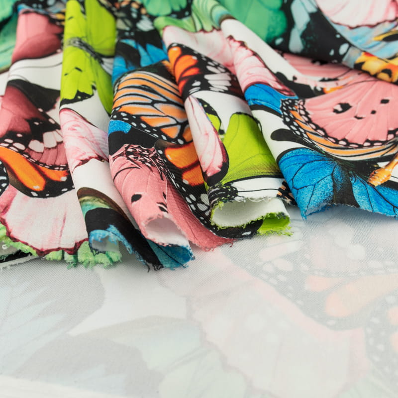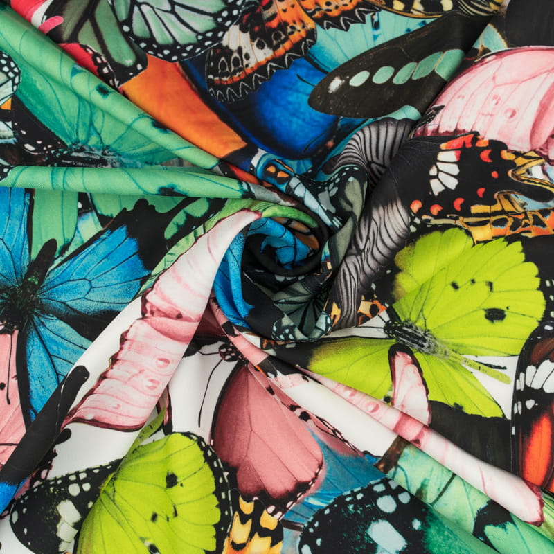 Tkanina Wiskoza Twill – wzór motyle, odcienie zielonego