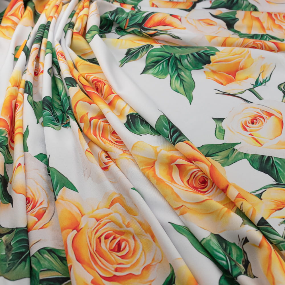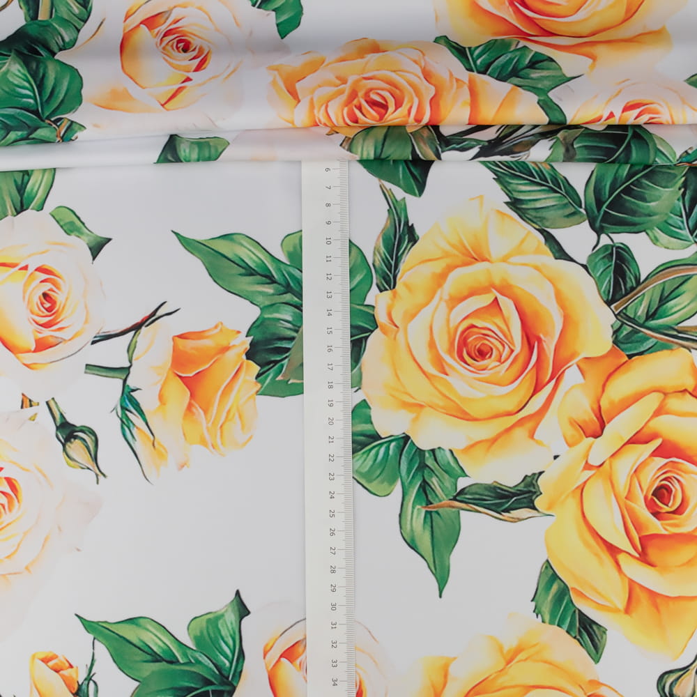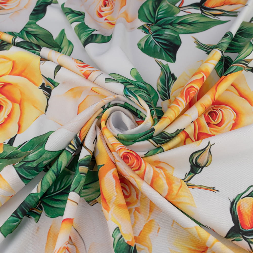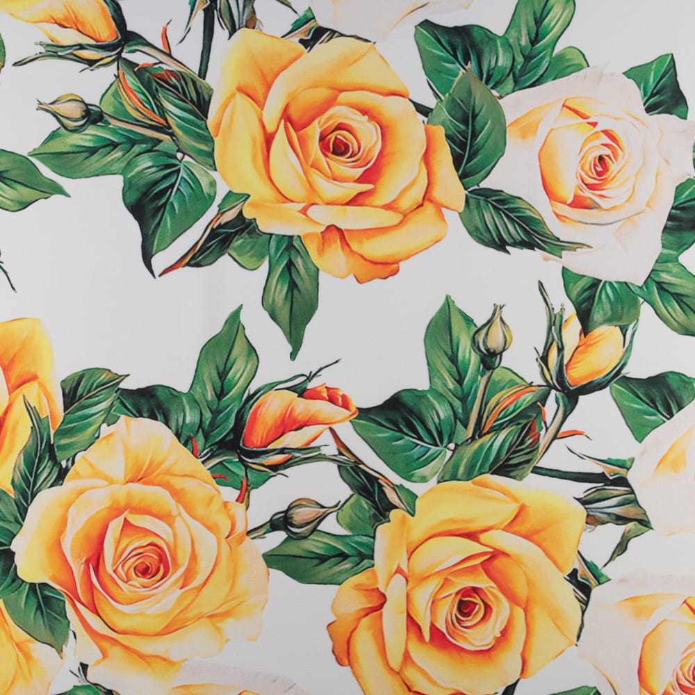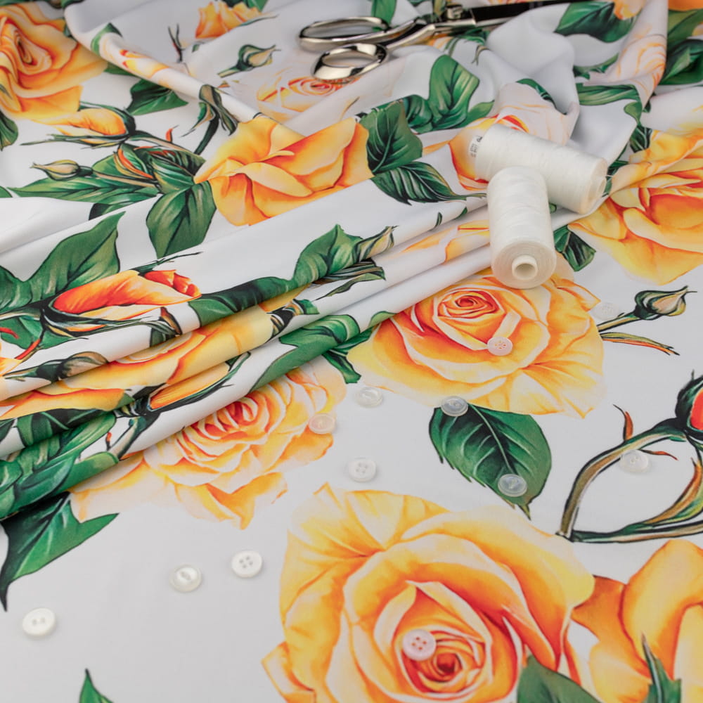 Tkanina Wiskoza Twill – wzór róże, kolor biały