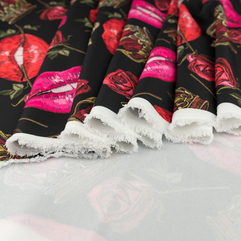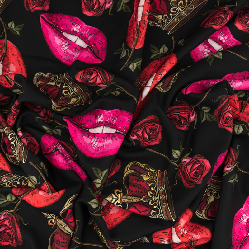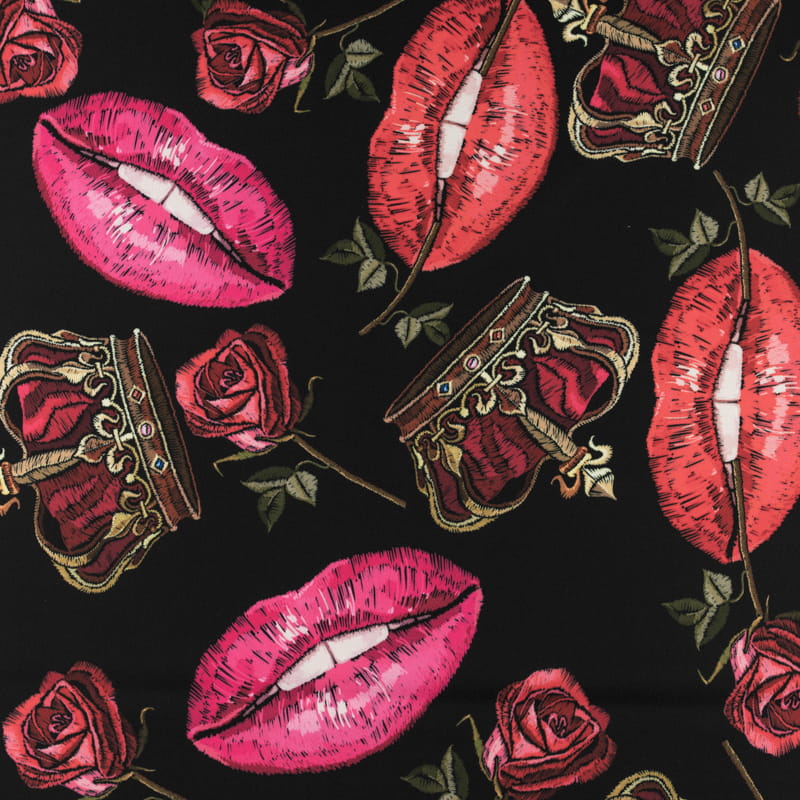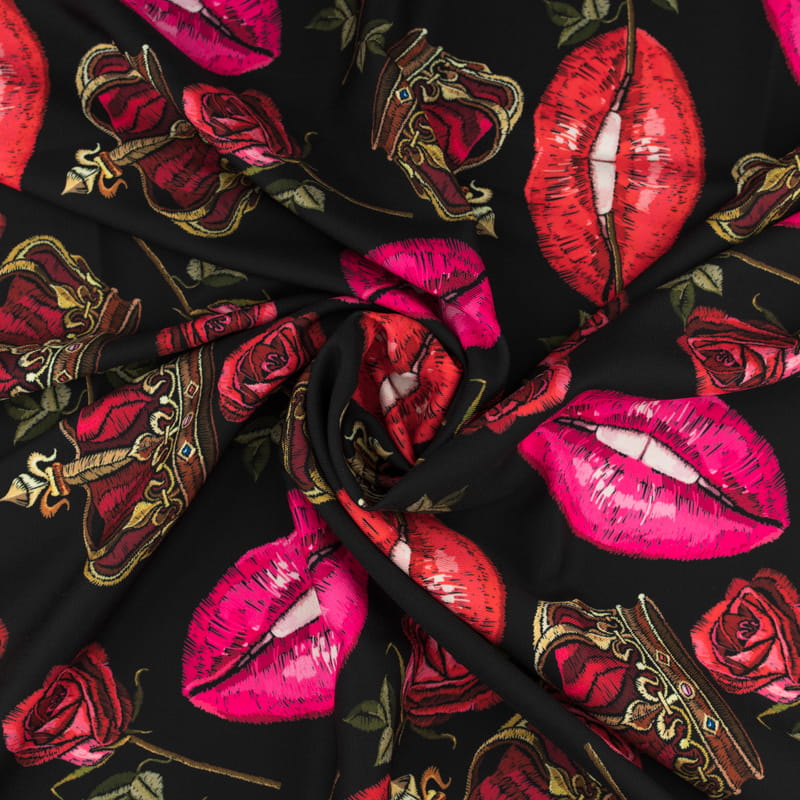 Tkanina Wiskoza Twill – wzór usta, kolor czarny