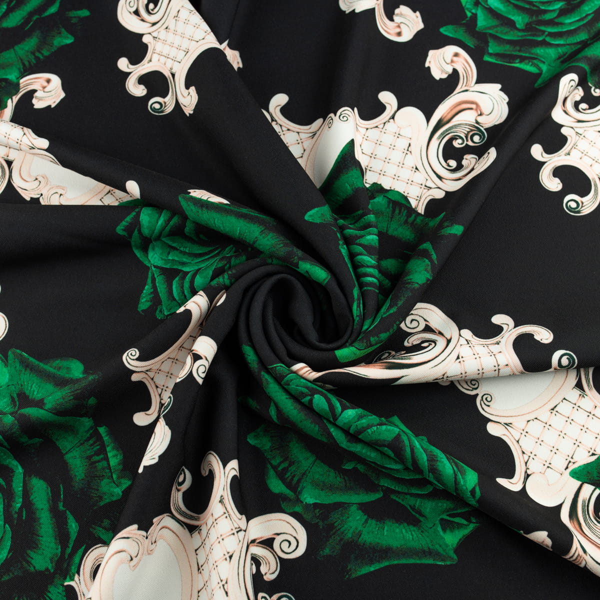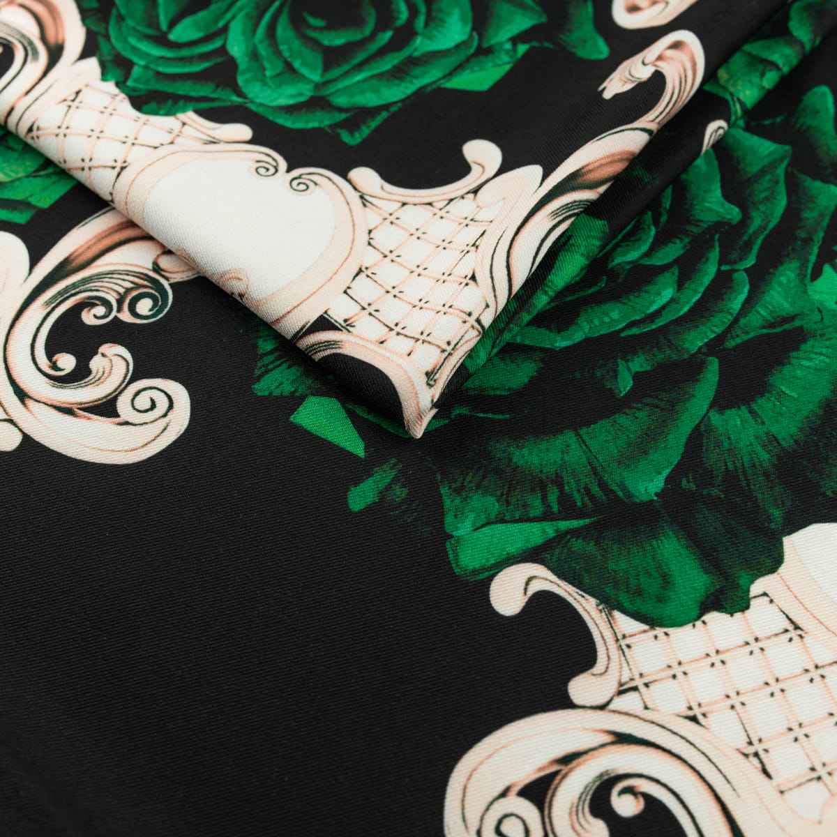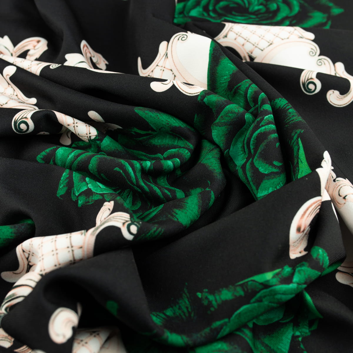 Tkanina wiskozowa twill z zielonymi kwiatami na czarnym tle to doskonały wybór dla osób ceniących elegancję i wygodę. Stwórz wyjątkowe kreacje i podkreśl swój styl!