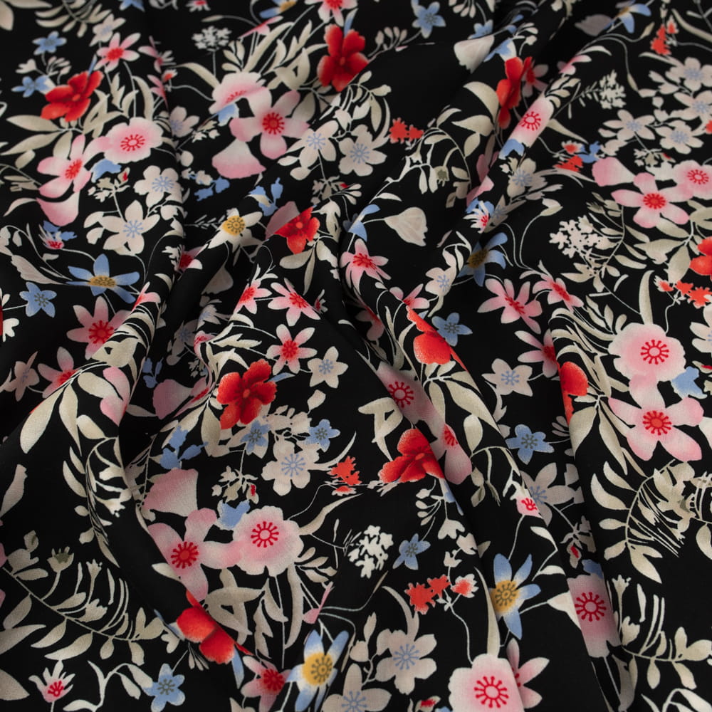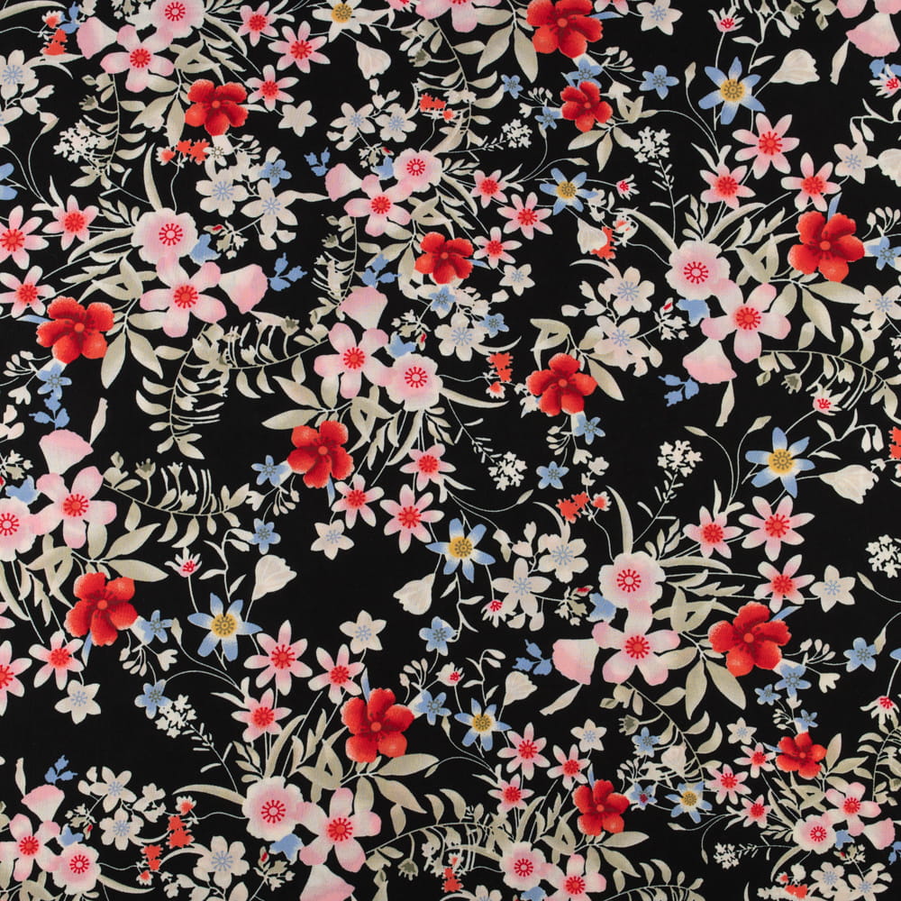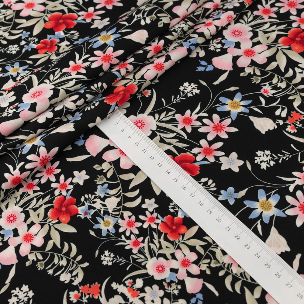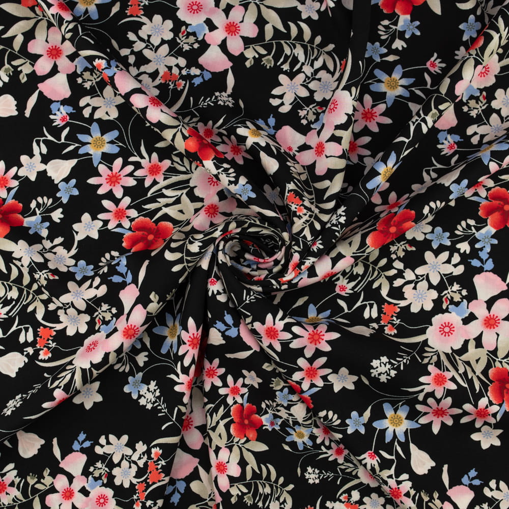 Elegancka tkanina wiskozowa z kwiatowym wzorem na czarnym tle