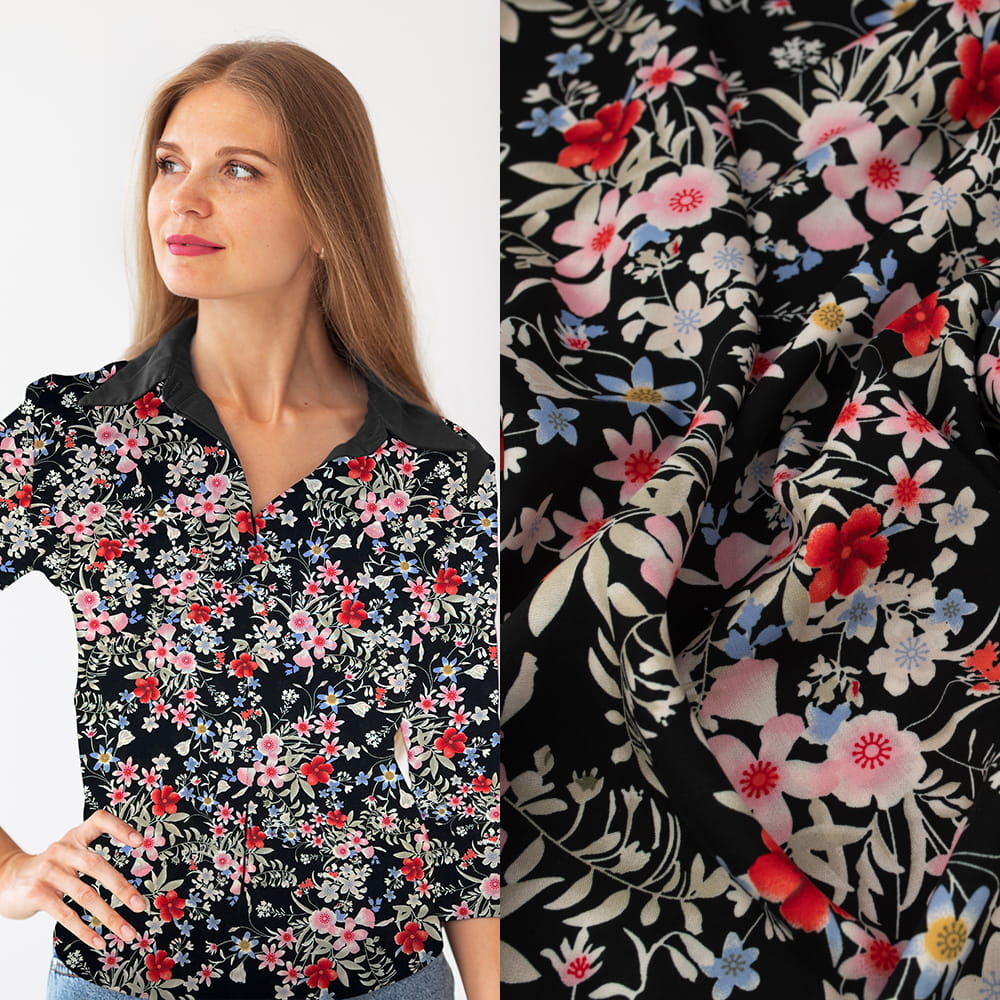 Elegancka i zwiewna tkanina wiskozowa z subtelnym kwiatowym wzorem na głębokim czarnym tle. Jej miękka, oddychająca struktura doskonale układa się na sylwetce, zapewniając komfort noszenia oraz stylowy, kobiecy wygląd. Idealna na romantyczne stylizacje, które łączą klasykę z lekkością.