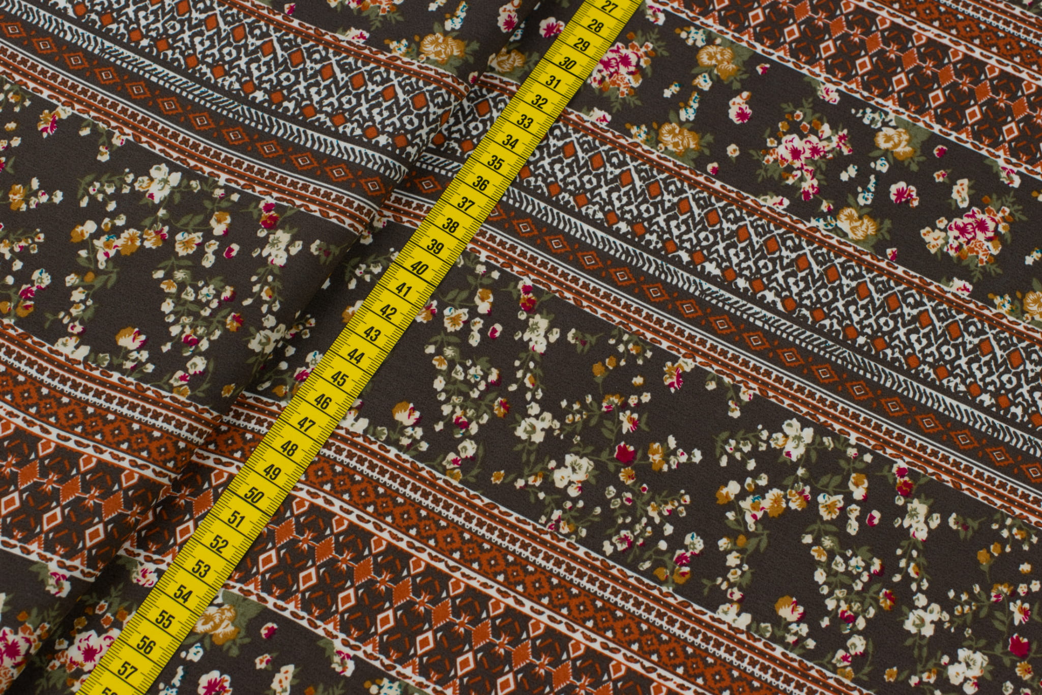 Stylowa i lekka tkanina wiskozowa z subtelnym wzorem szlaczków i kwiatów w odcieniu feldgrau. Dzięki swojej przewiewnej i miękkiej strukturze doskonale sprawdzi się w zwiewnych kreacjach na co dzień i na specjalne okazje. Tkanina pięknie układa się na sylwetce, zapewniając komfort noszenia oraz elegancki wygląd.