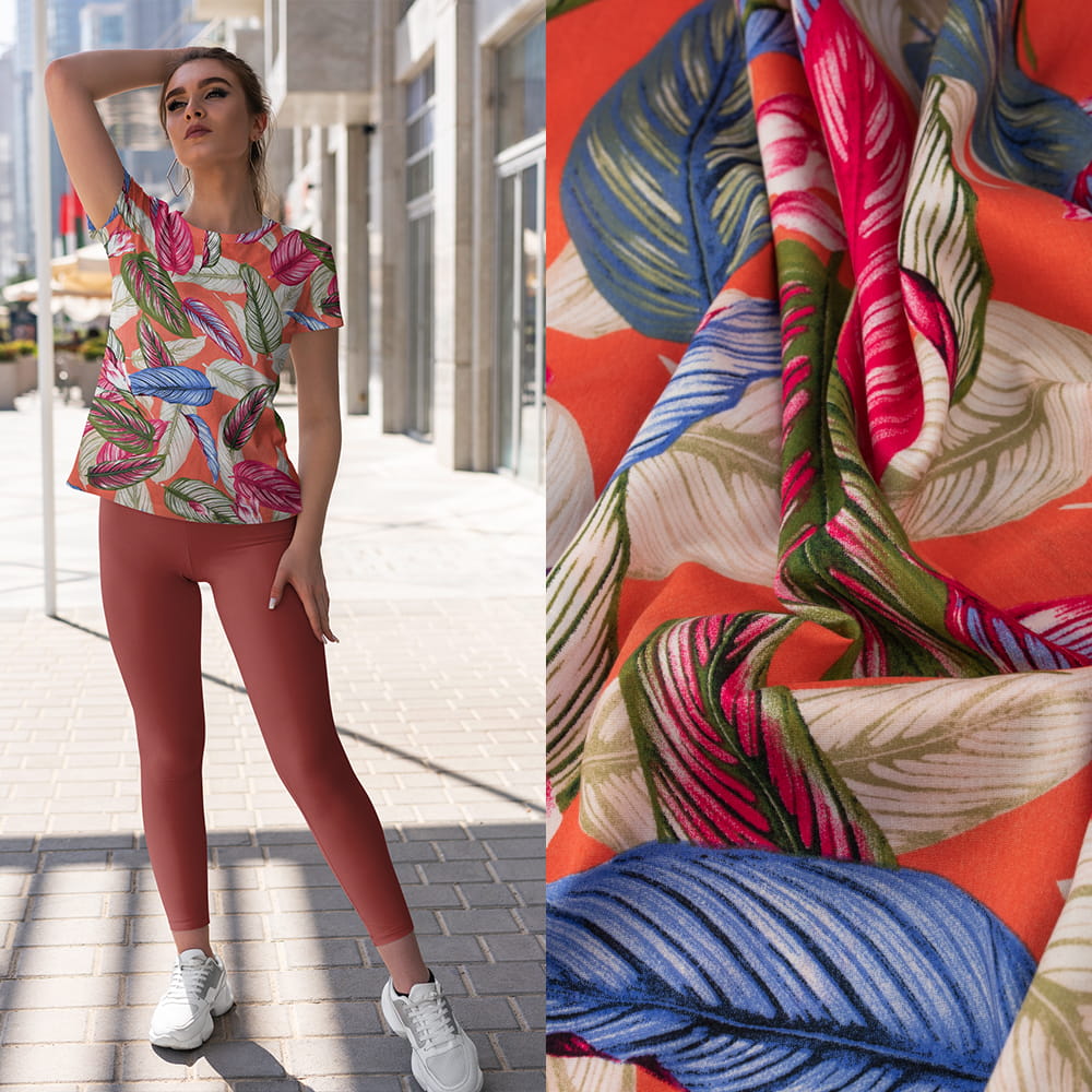 Stylowa tkanina wiskozowa z motywem liści w odcieniach pomarańczy