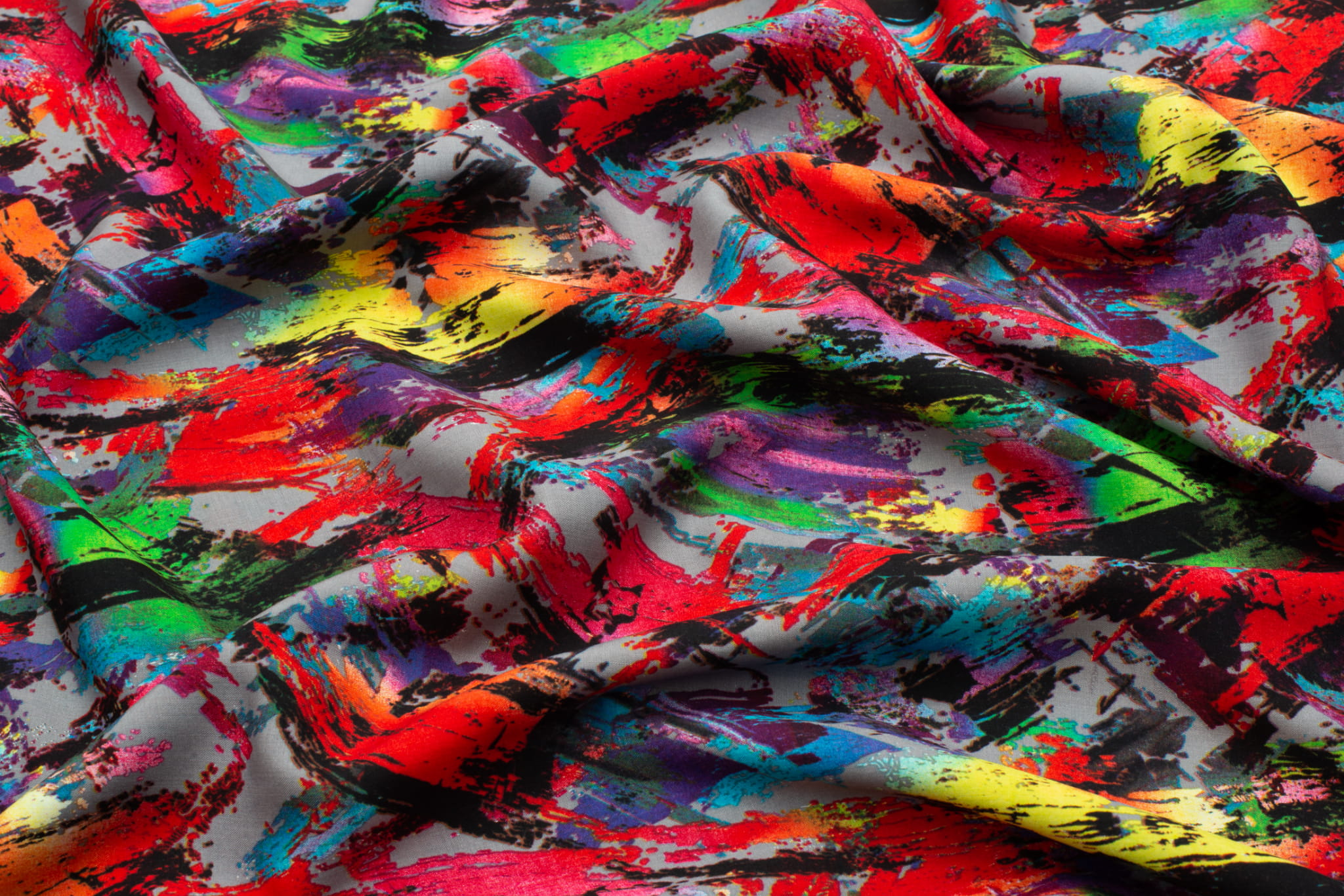 Elegancka i lekka tkanina wiskozowa z artystycznym wzorem przypominającym malowane pociągnięcia pędzla na subtelnym szarym tle. Jej miękka i przewiewna struktura sprawia, że doskonale układa się na sylwetce, zapewniając komfort noszenia i nowoczesny wygląd. Idealna na modne i stylowe kreacje na każdą okazję.