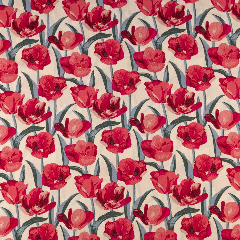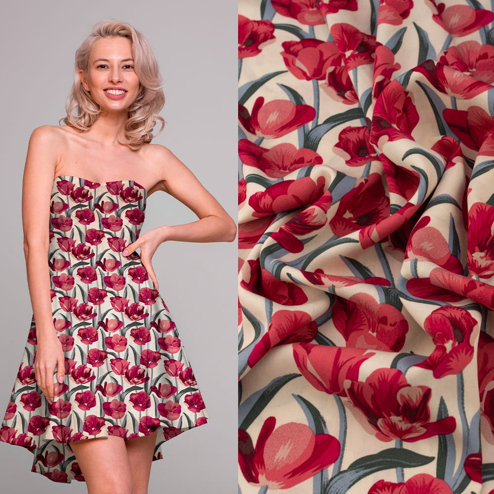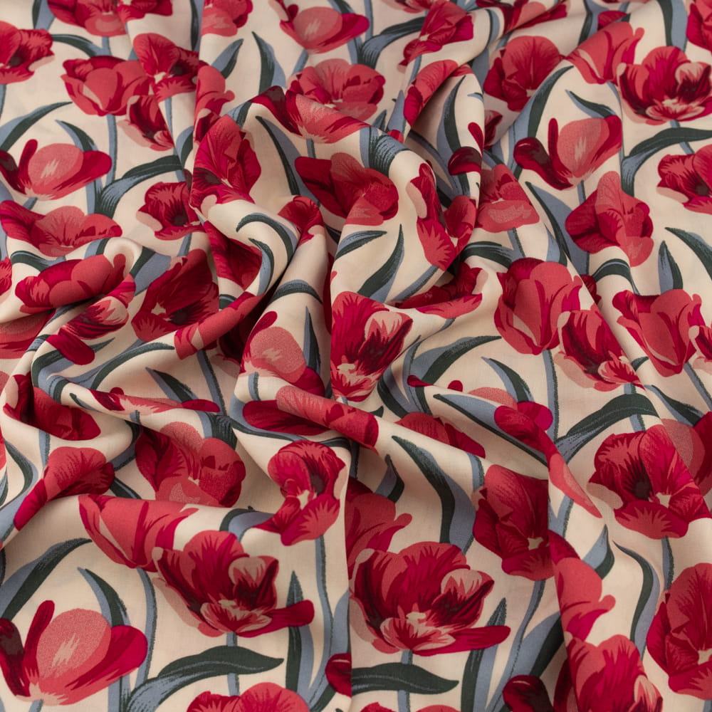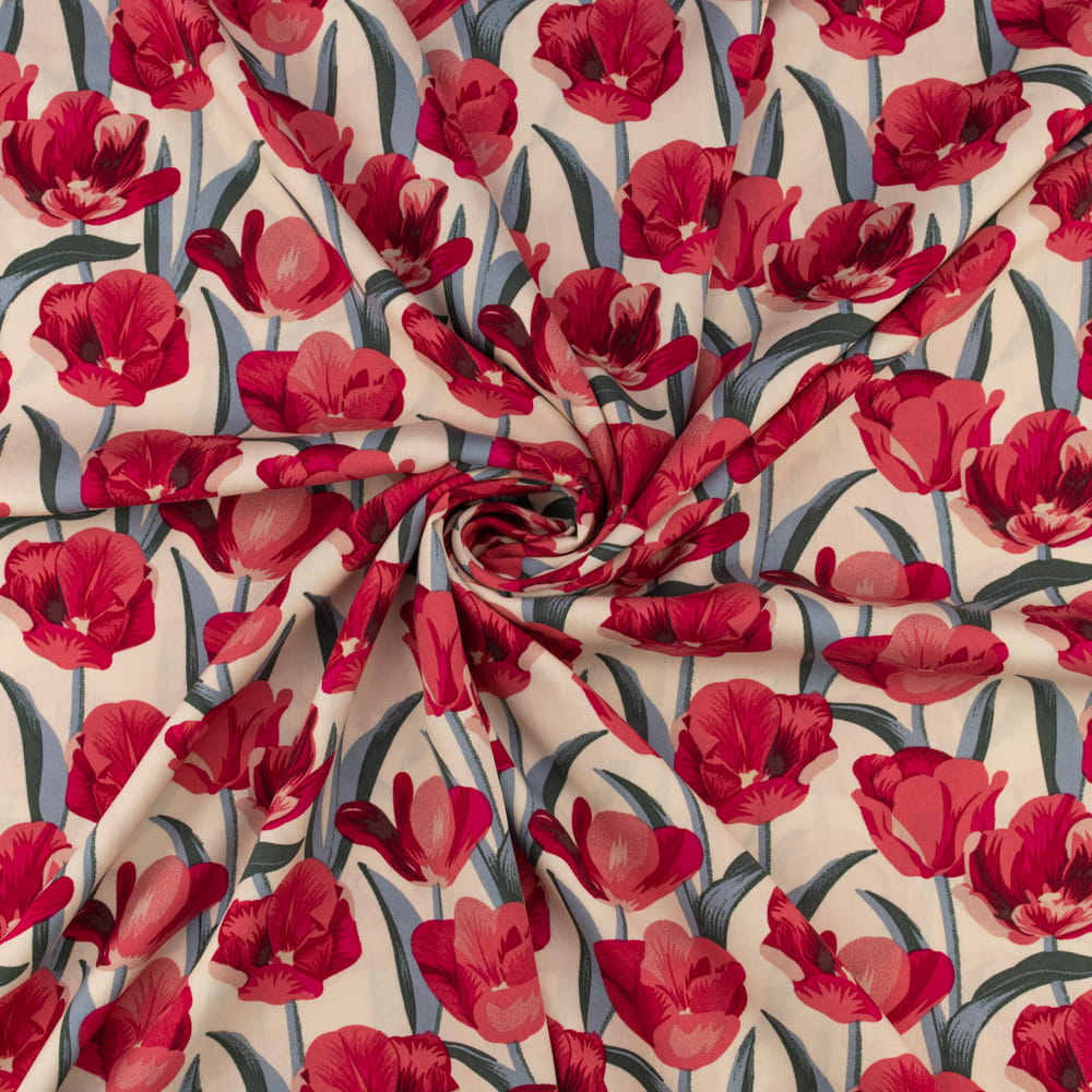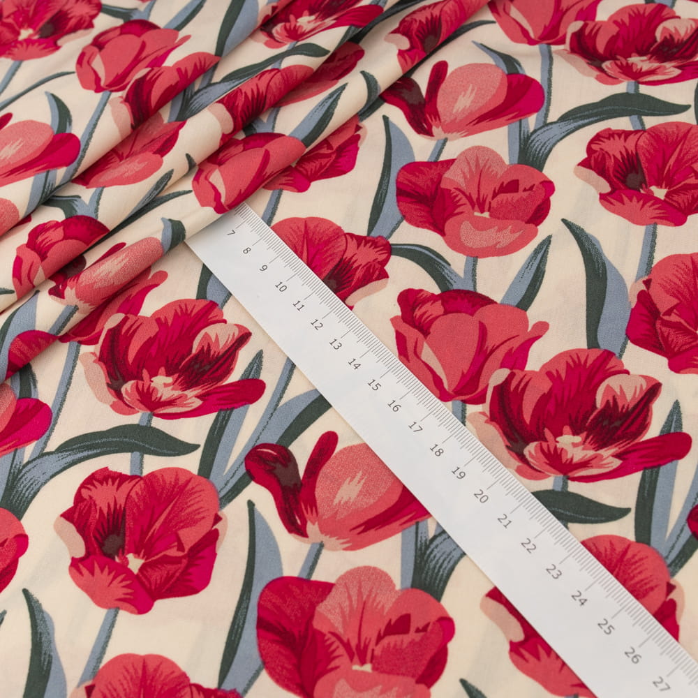 Tkanina Wiskoza – wzór tulipany, kolor beżowy