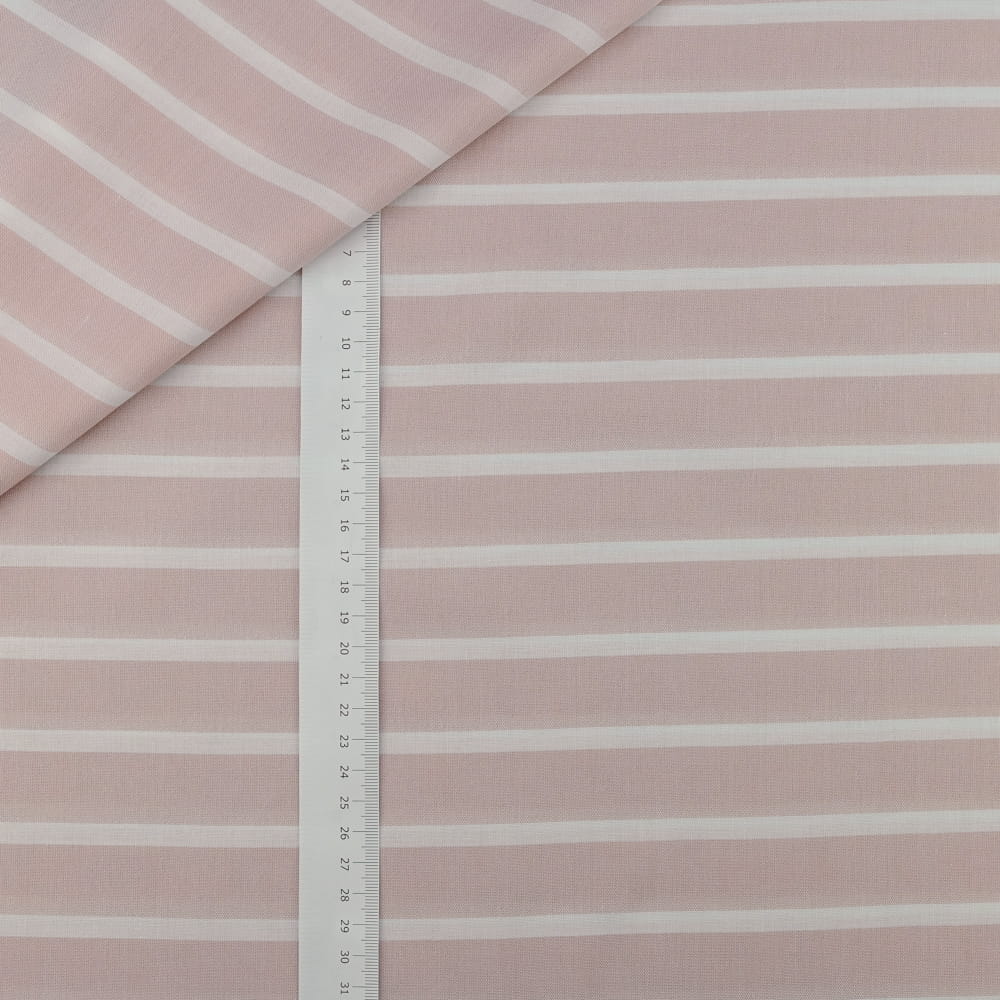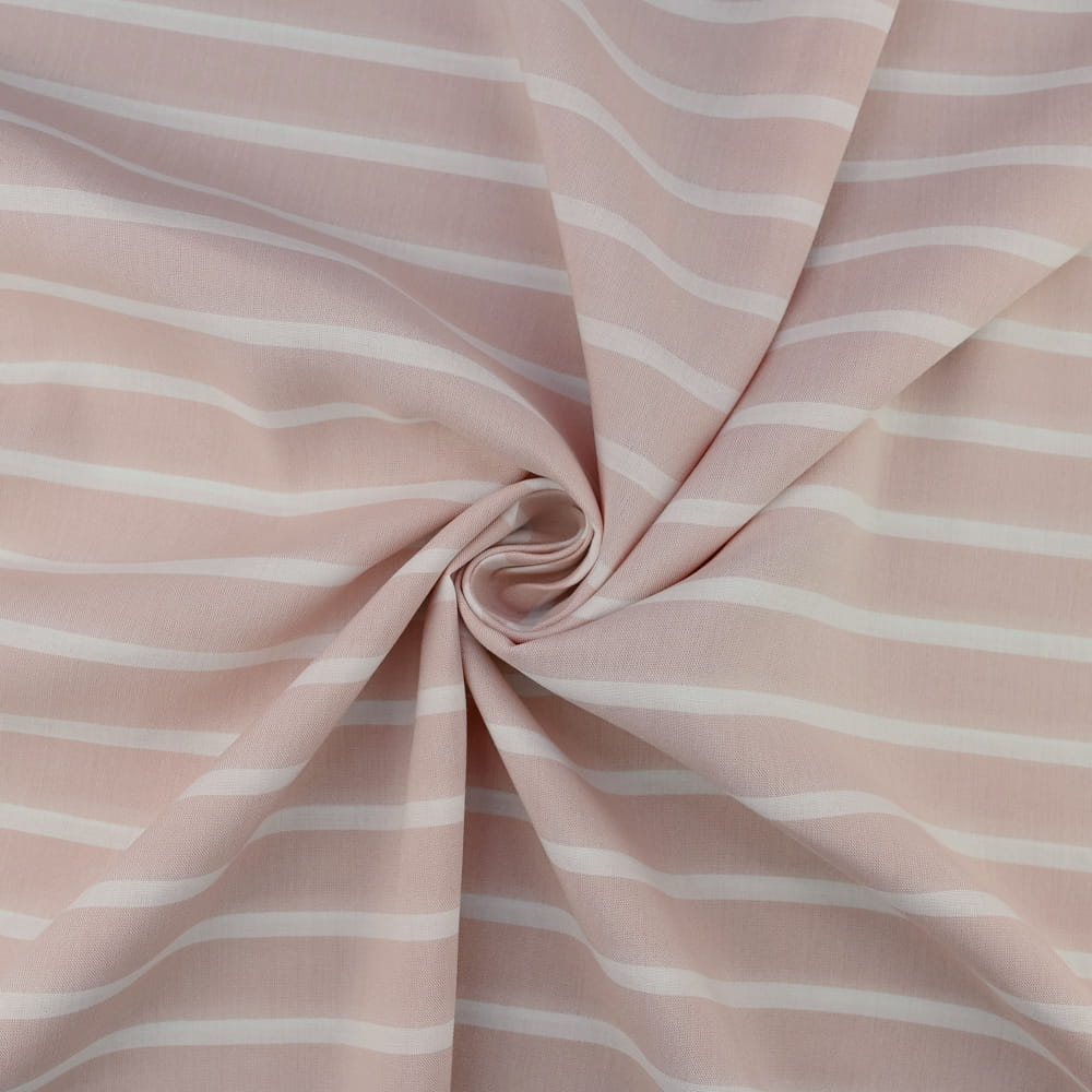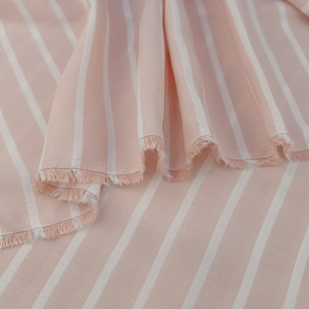 Subtelna i lekka tkanina wiskozowa w elegancki wzór pasów w jasnoróżowym odcieniu. Idealna dla osób ceniących delikatność, wygodę i kobiecy styl. Dzięki swojej przewiewnej strukturze i miękkości doskonale sprawdzi się w codziennych oraz bardziej eleganckich stylizacjach. Świetnie układa się na sylwetce, zapewniając komfort noszenia przez cały dzień.