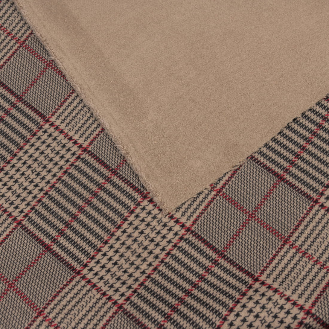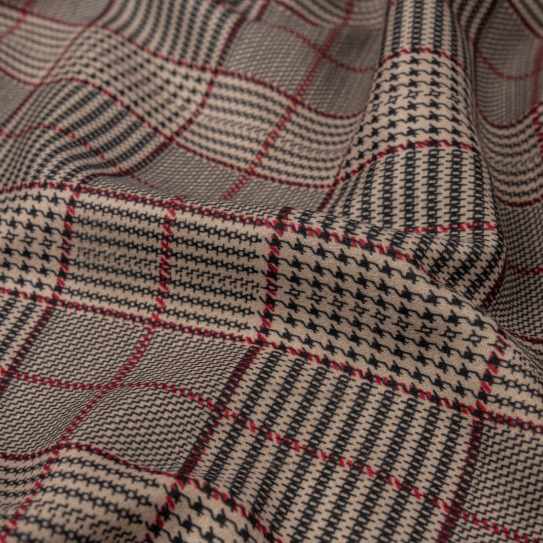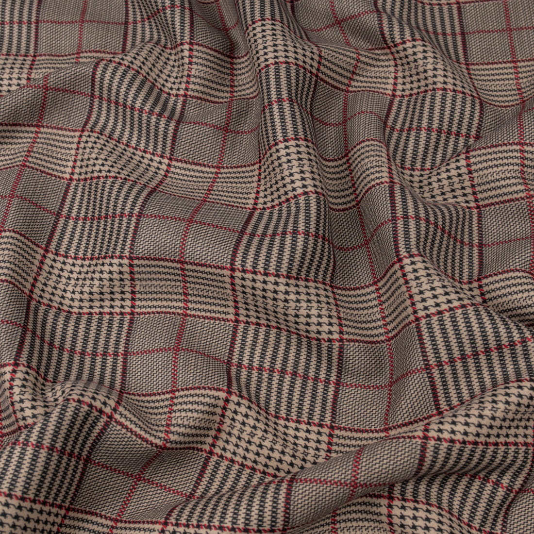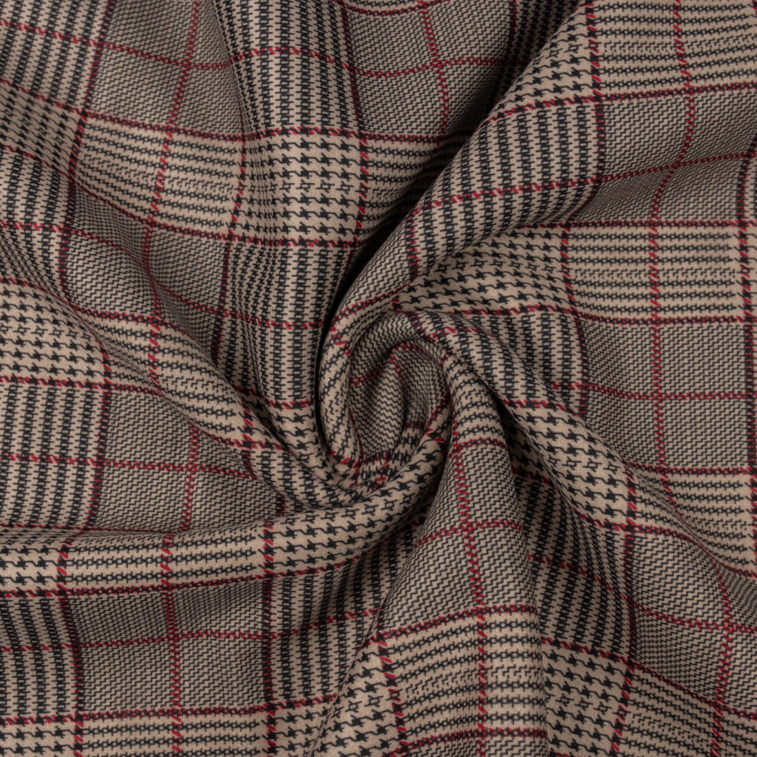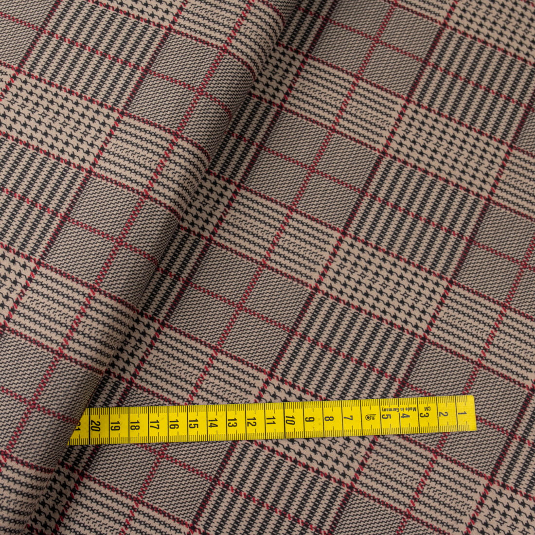 Tkanina płaszczowa wzór kratka w odcieniu czerwieni i czerni na beżowym tle