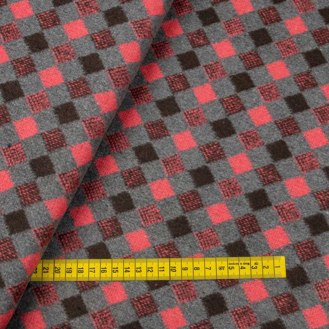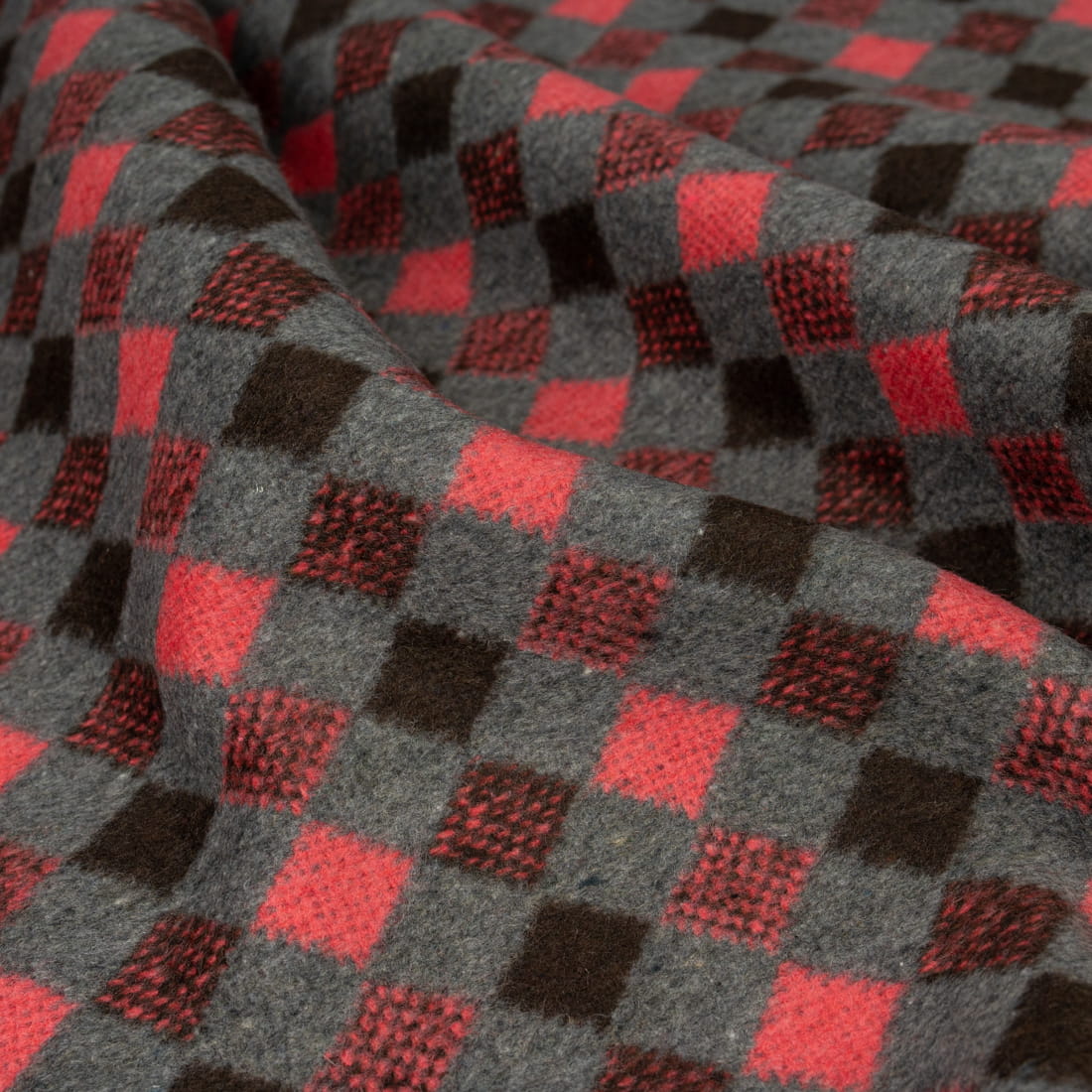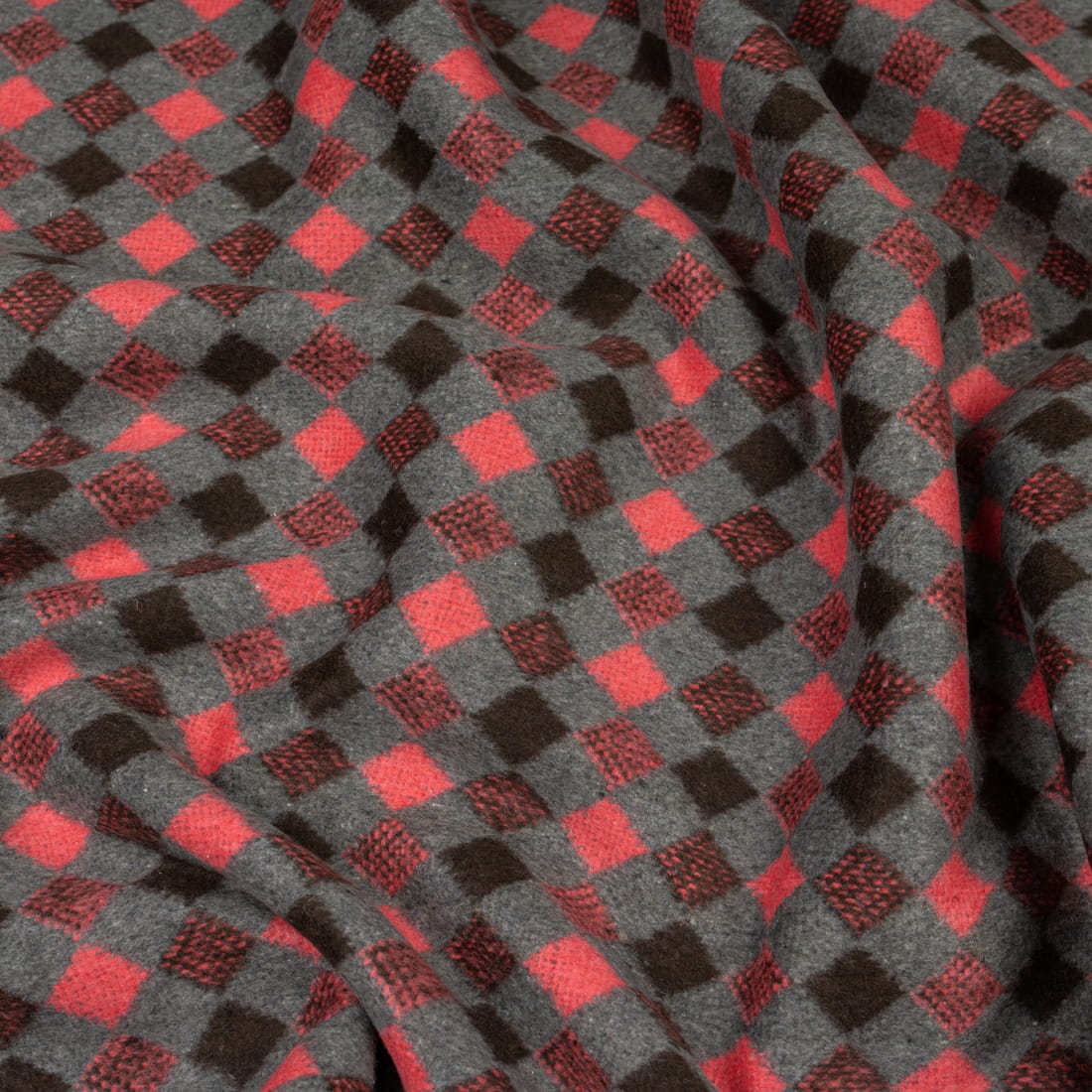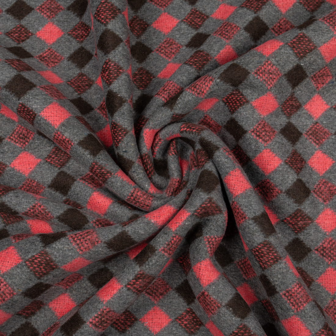 Tkanina płaszczowa wzór romby koralowo-brązowe na szarym tle