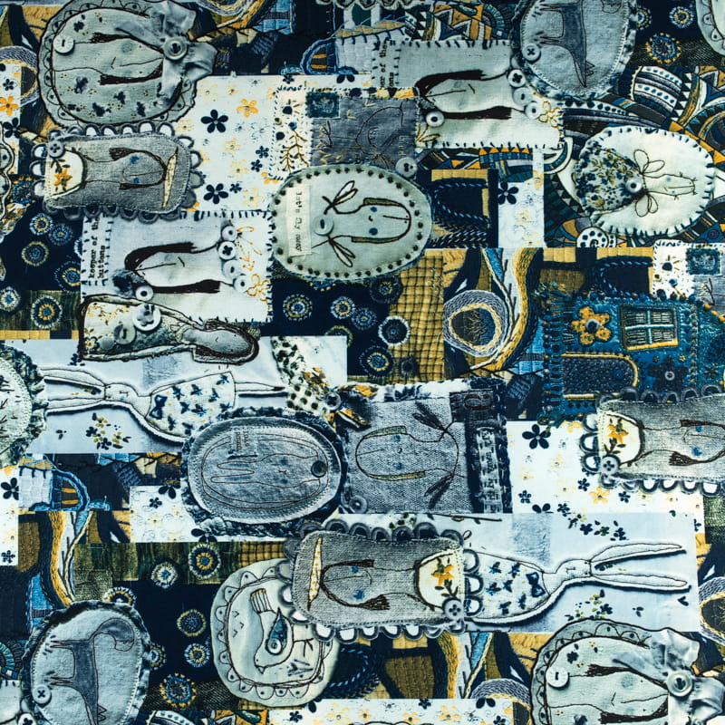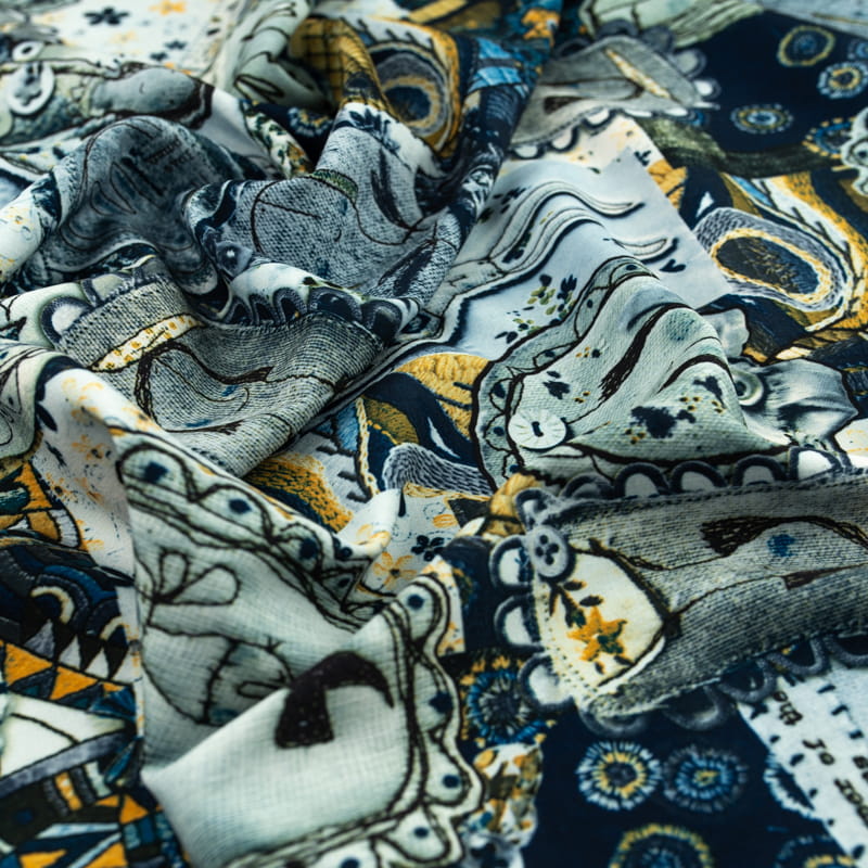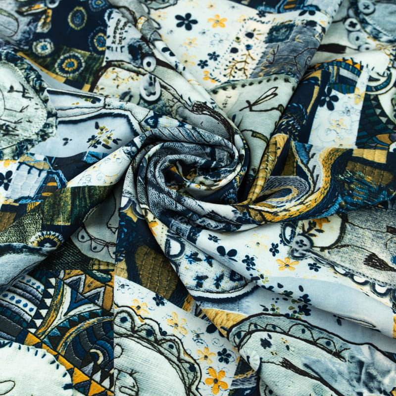 Tkanina silki wzór naszywki i łatki kolor szaro granatowy