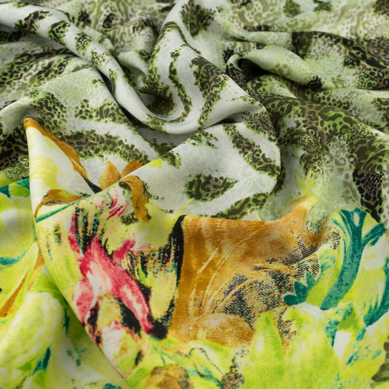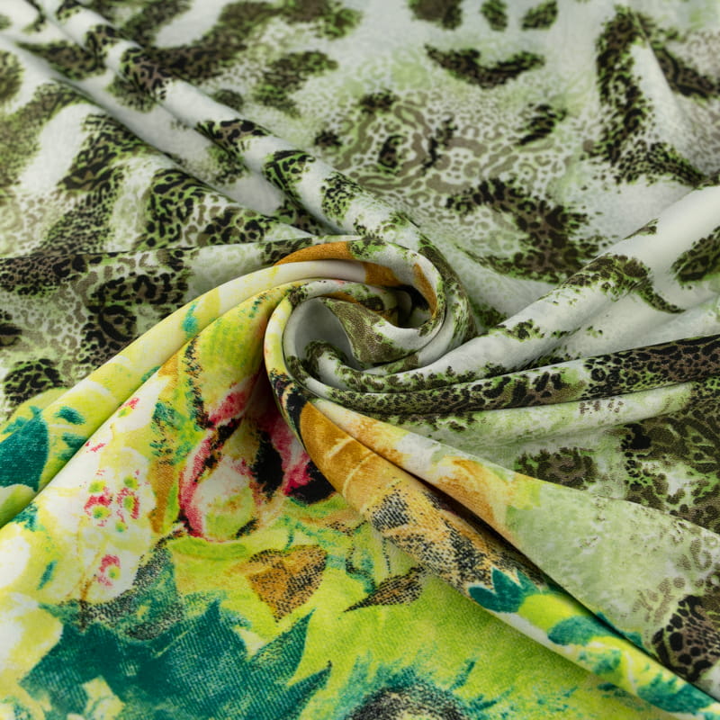 Tkanina silki wzór panterka i kwiaty kolor zielony