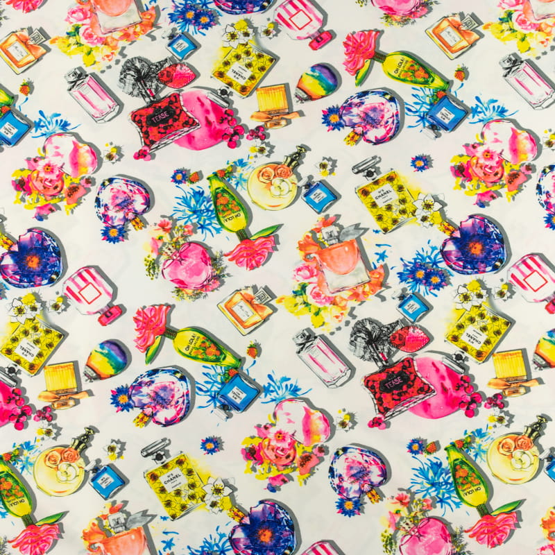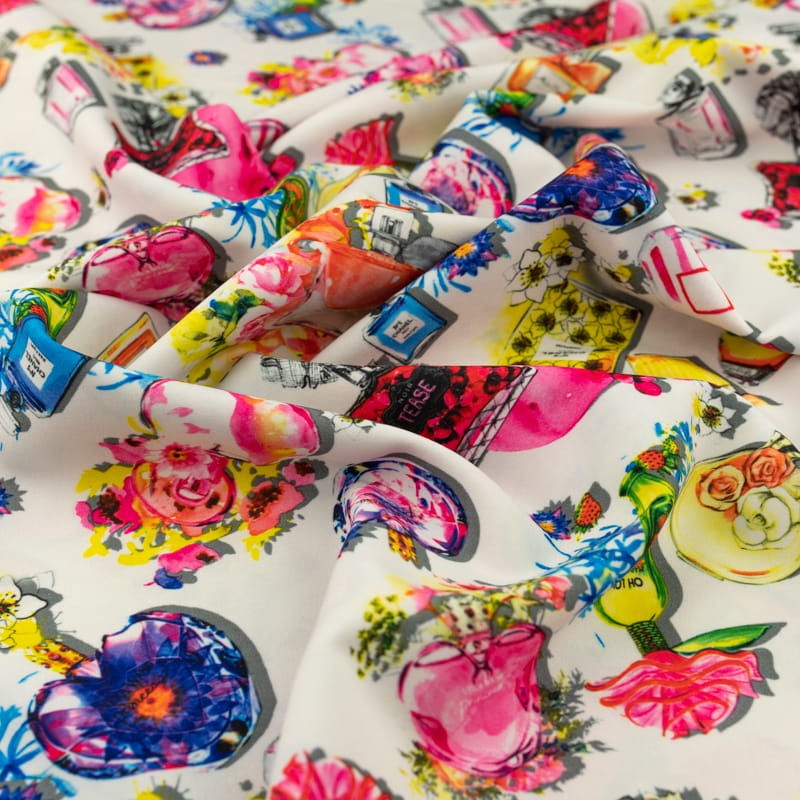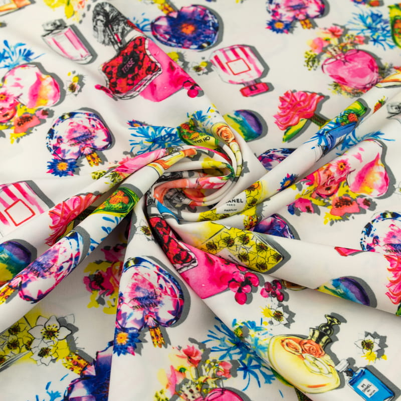 Tkanina silki wzór perfumy i kwiaty kolor kremowy