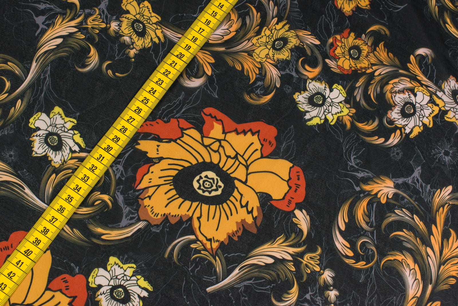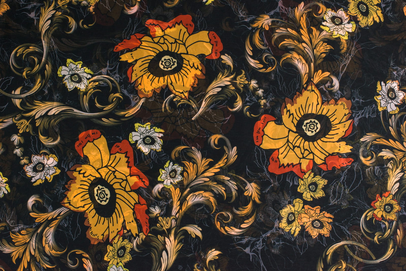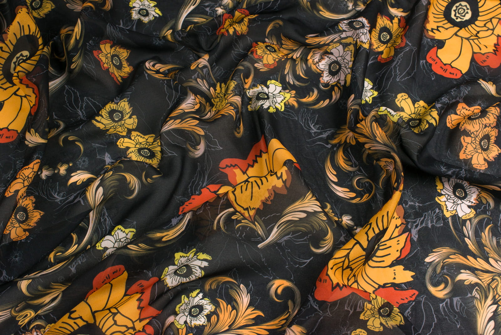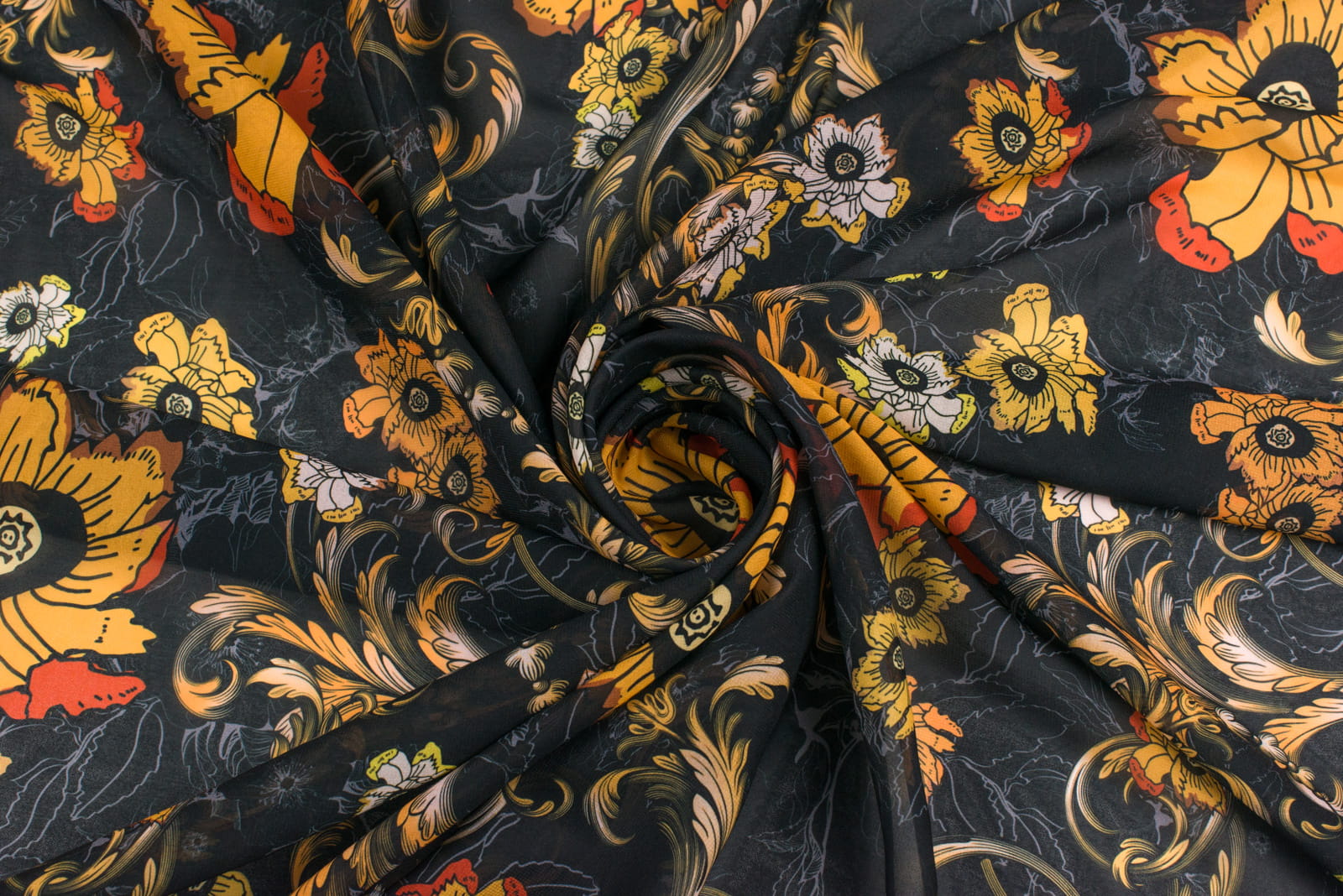 Tkanina szyfon w kwiaty na czarnym