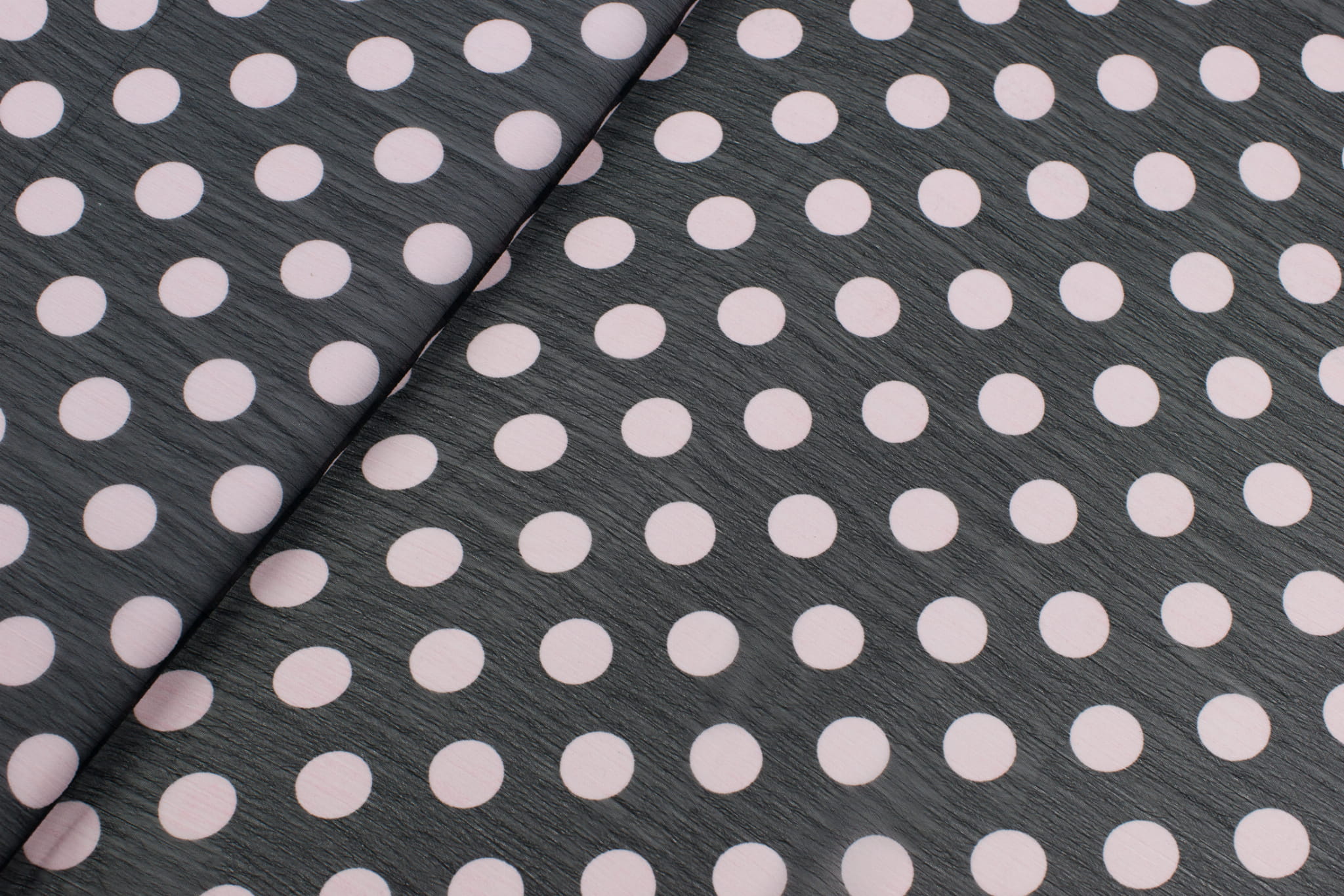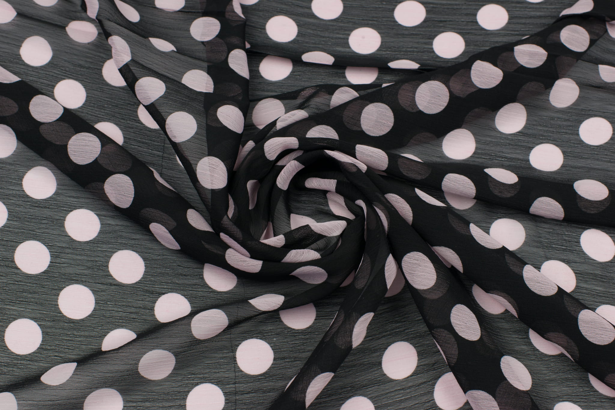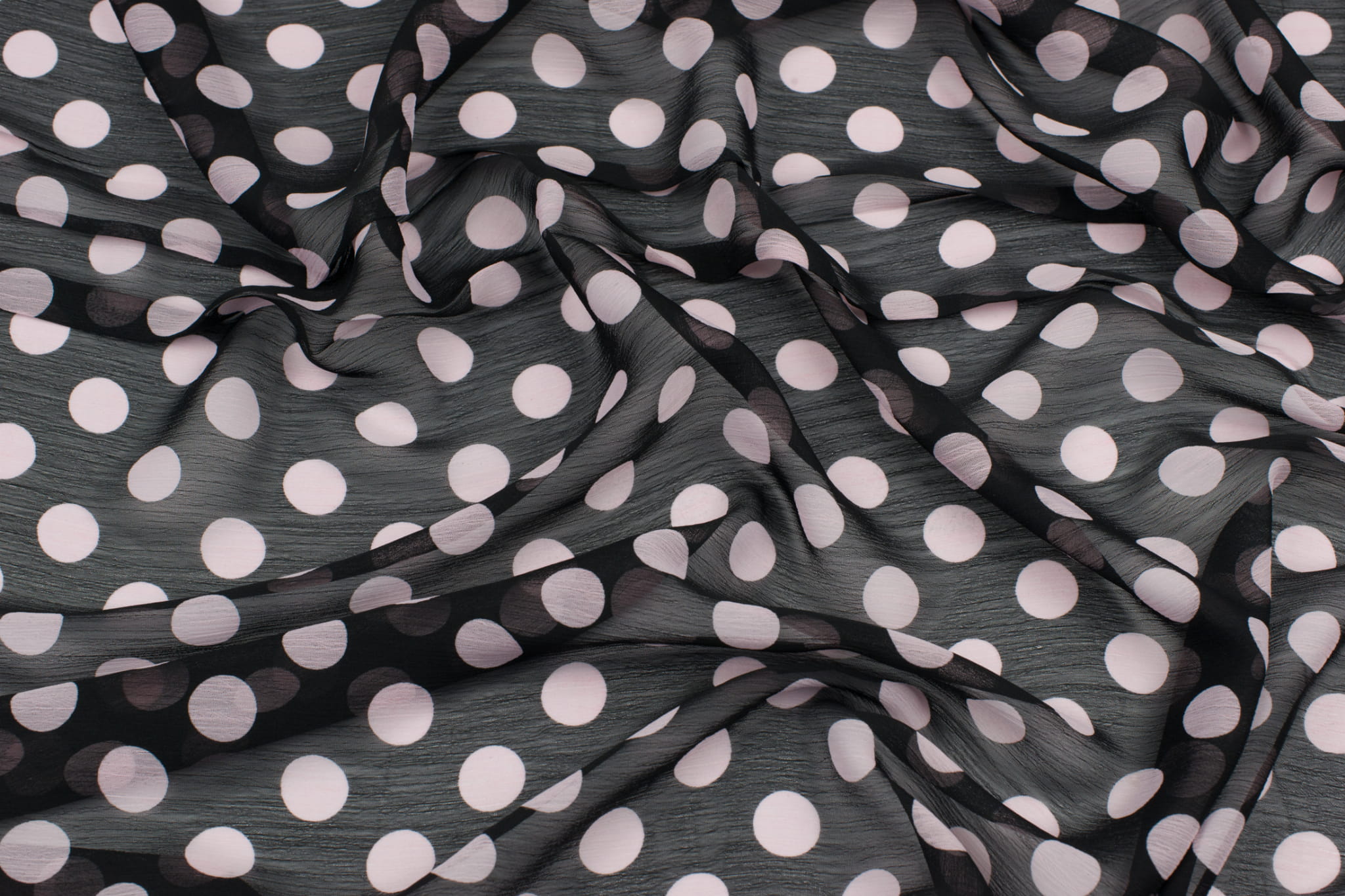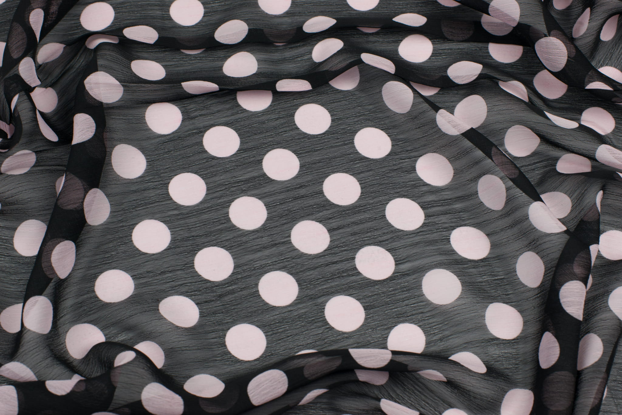 Tkanina szyfon wzór grochy jasnoróżowe na czarnym tle