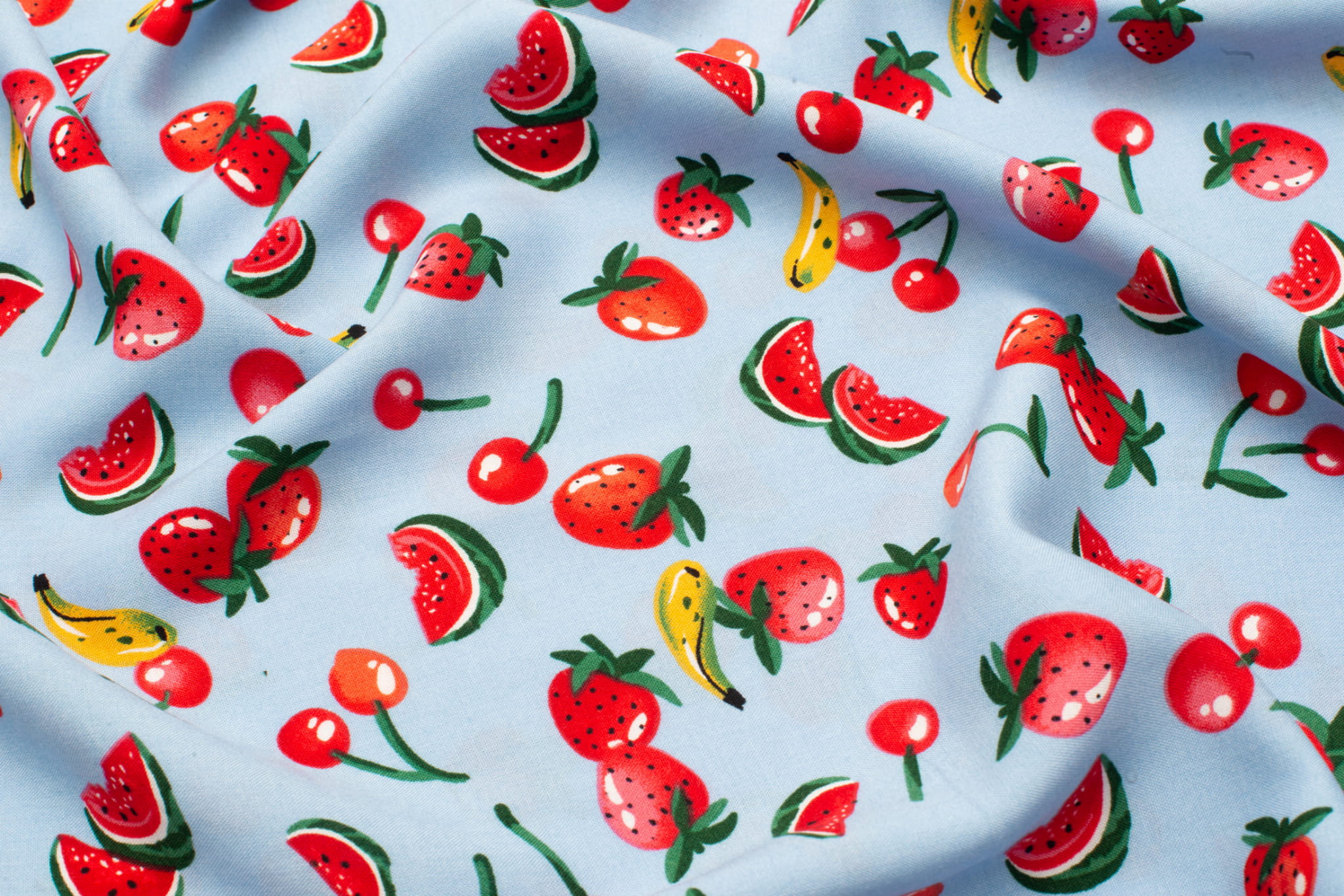 Tkanina wiskoza owoce na błękitnym tle