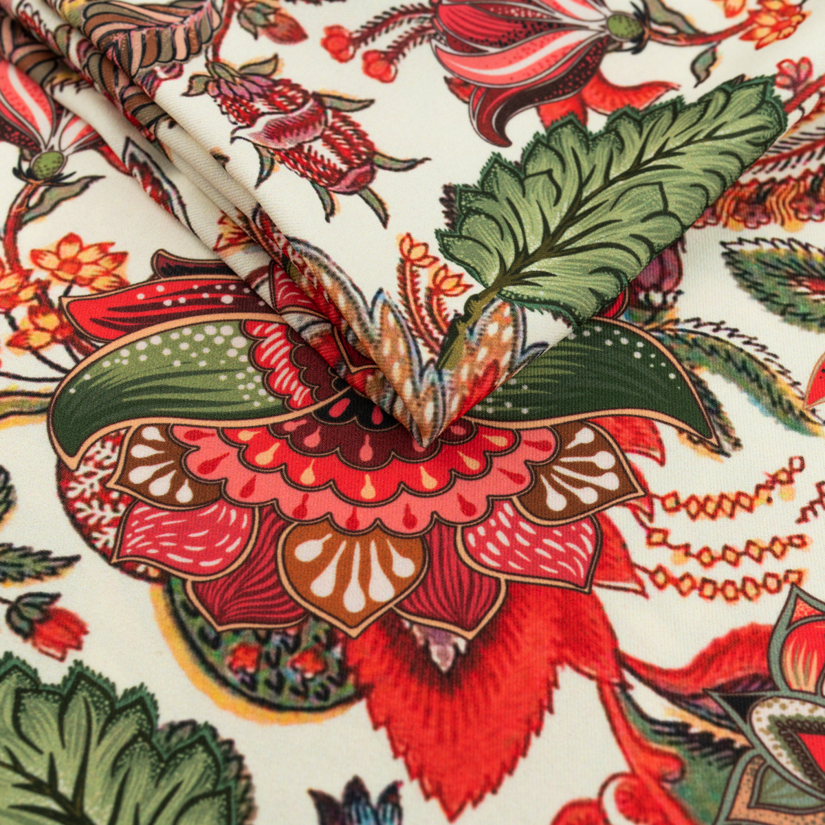 Nadruk naniesiono nowoczesną techniką reaktywną, cyfrową. Dzięki temu print jest trwały, cieszy się doskonałym wysyceniem barw oraz ostrością krawędzi wzoru. Wiskoza jest nieelastyczna bardzo przyjemna i delikatna, układa się miękko i lekko.