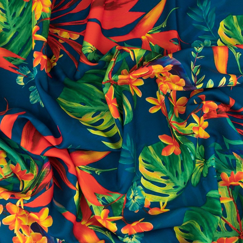 Tkanina wiskoza twill wzór egzotyczne kwiaty kolor zielony