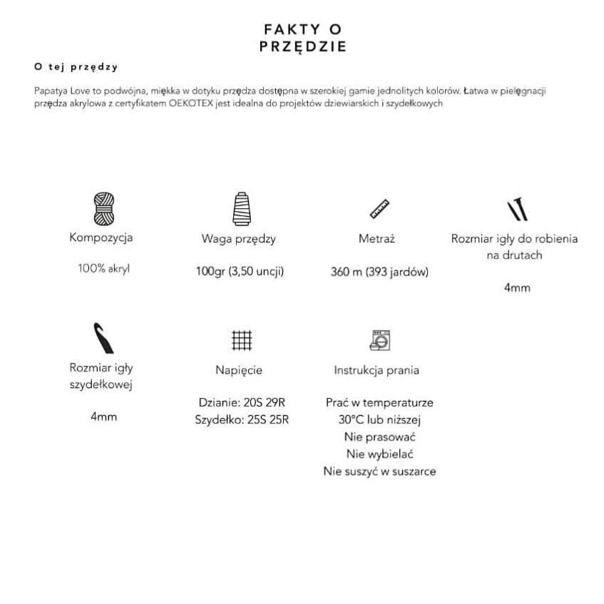 Wysoko jakościowy delikatny i miękki akryl rozpoznawalnej na całym świecie tureckiej firmy Papatya. Przędza ładnie skręcona ale niezbyt ściśle co pozwala jej na "oddychanie" czyli sprężystość. Polecana jest na wyroby typu swetry, kardigany, czapki, szaliki oraz na amigurumi.